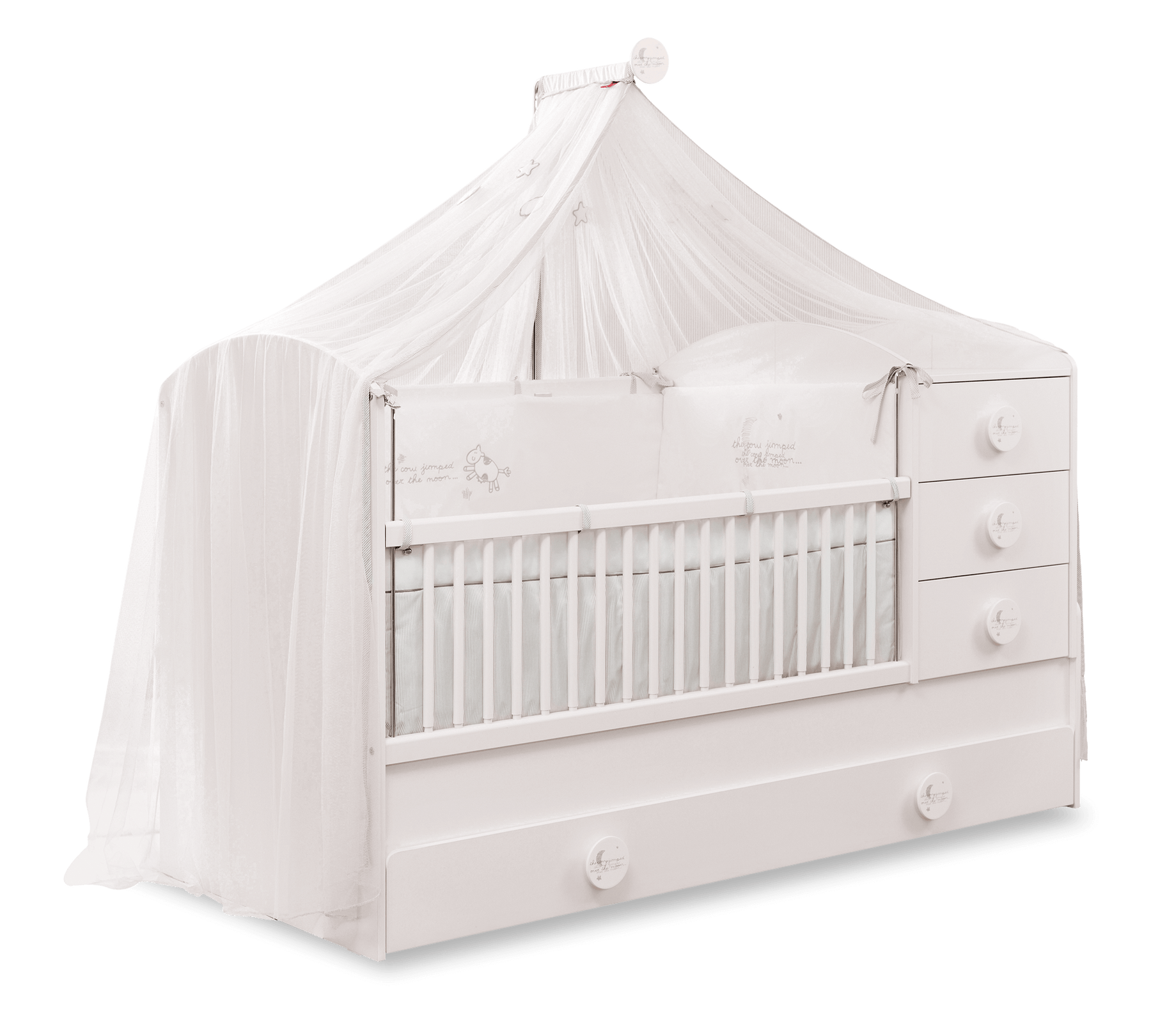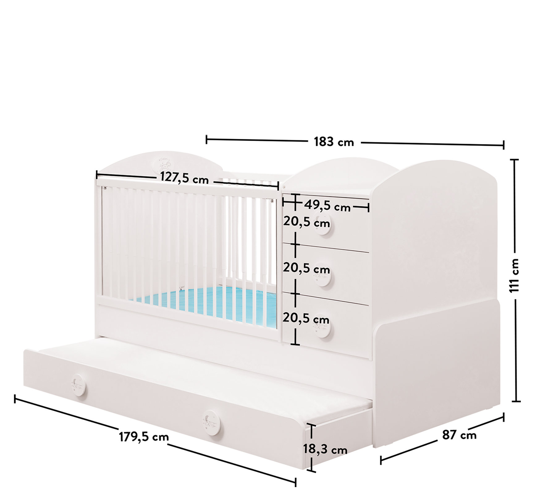 Karrigia është 80x130 cm për periudhën e fëmijërisë, por ka një aftësi për t'u zgjeruar deri në 80x180 cm për të qenë e përdorshme nga mosha 0-3 vjeçare deri në 3-10 vjeçare, me kapacitet ngarkese prej 80 kg. Moduli ka tre sirtarë dhe regjistra rafesh për një hapësirë të gjerë ruajtjeje. Për sigurinë e foshnjës tuaj, karrigia Baby Cotton SL e rritshme (me karrigë për prindër) mund të përdoret me lehtësi në përmasa 80x180 cm, duke pasur këndet e dizajnuara në mënyrë të përndjekur.