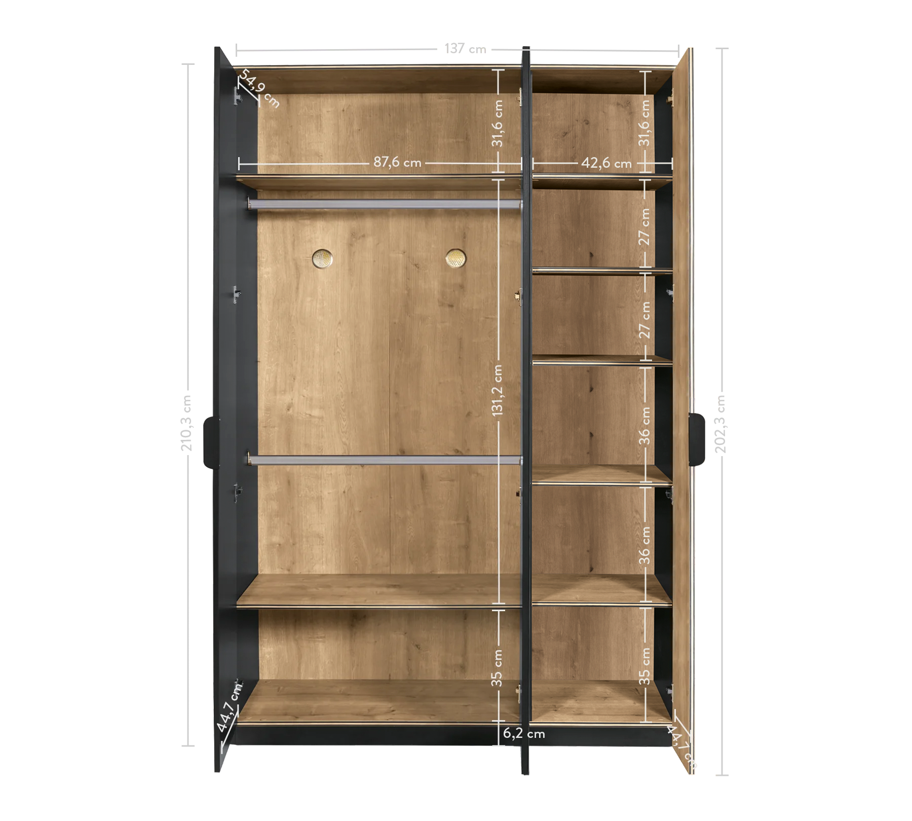 Gjerësia: 137 cm | Lartësia: 210,3 cm | Thellesi: 59,7 cm