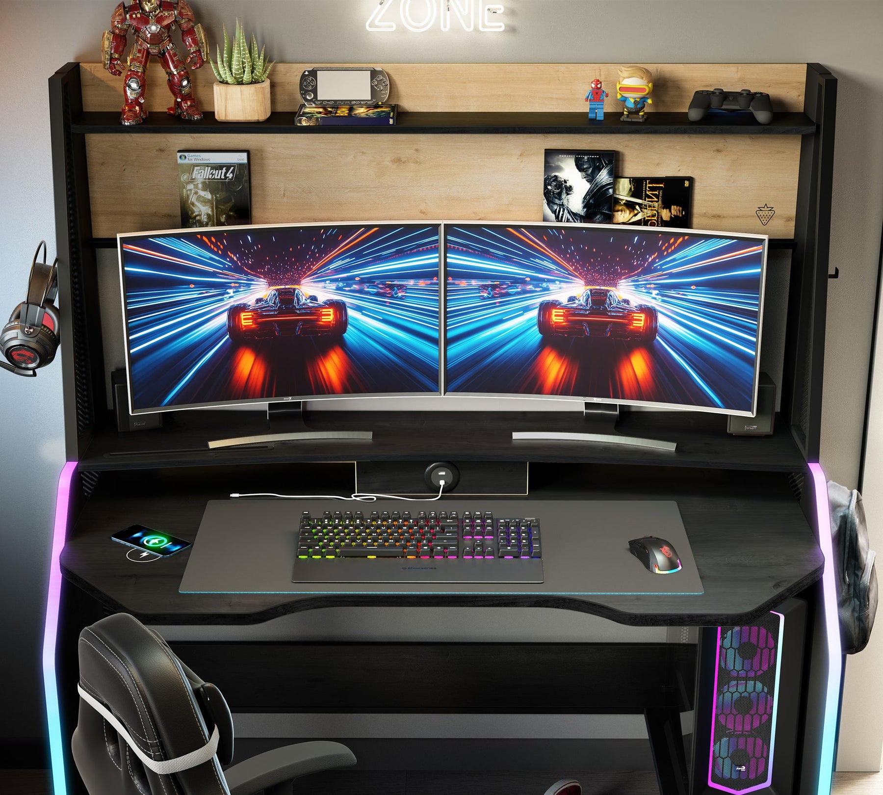 Ndriçimi RGB me telekomandë i vendosur në pjesën e përparme të paneleve anësore, i jep energji dhe stil zonës së lojërave; ndërsa seksioni i veçantë nën tavolinë ofron një zgjidhje ideale për vendosjen e një kasete kompjuteri.