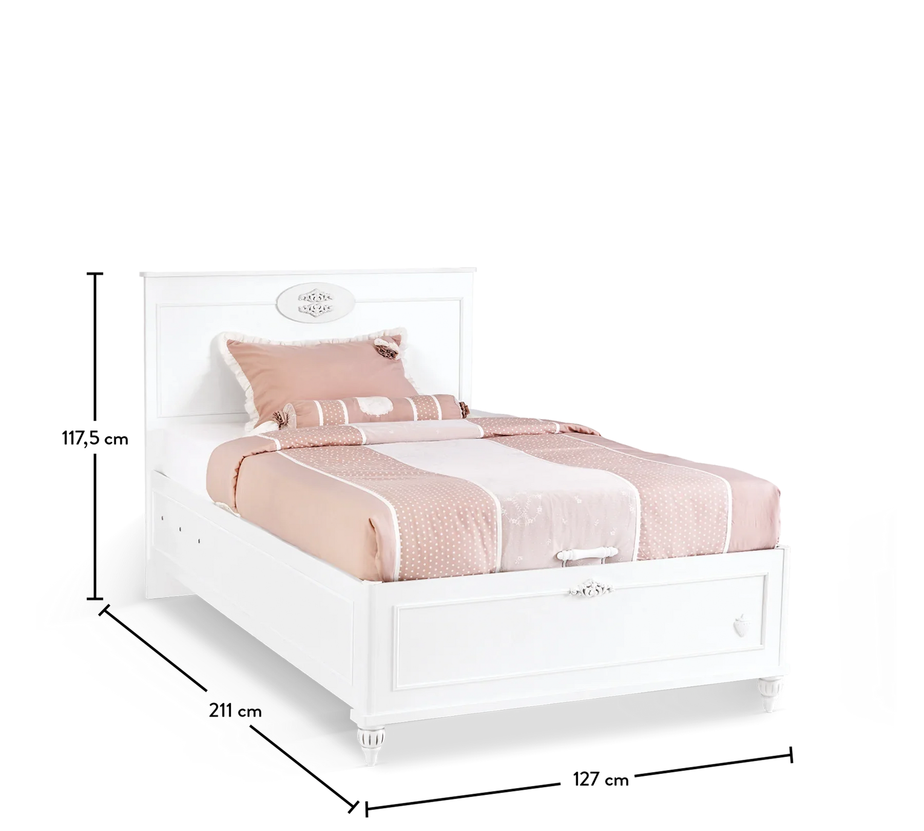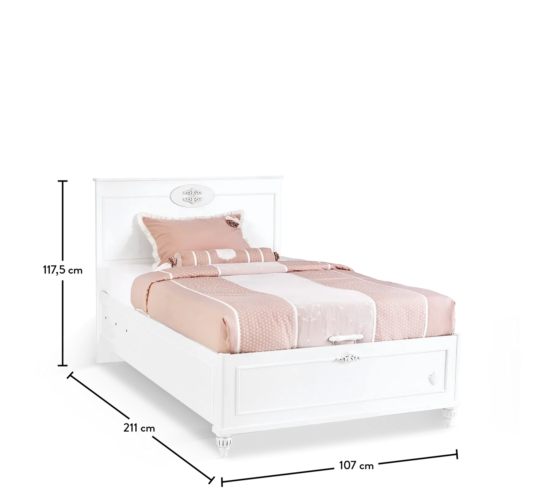 Bazalı karyola në përmasa 100x200 dhe 120x200 cm, është e gjerë sa fëmija yt mund të flejë rehat. Krye karyolës e zbukuruar me reze të veçantë të serisë Romantica, e kthen dizajnin e ëndrrave të fëmijës tënd në realitet.