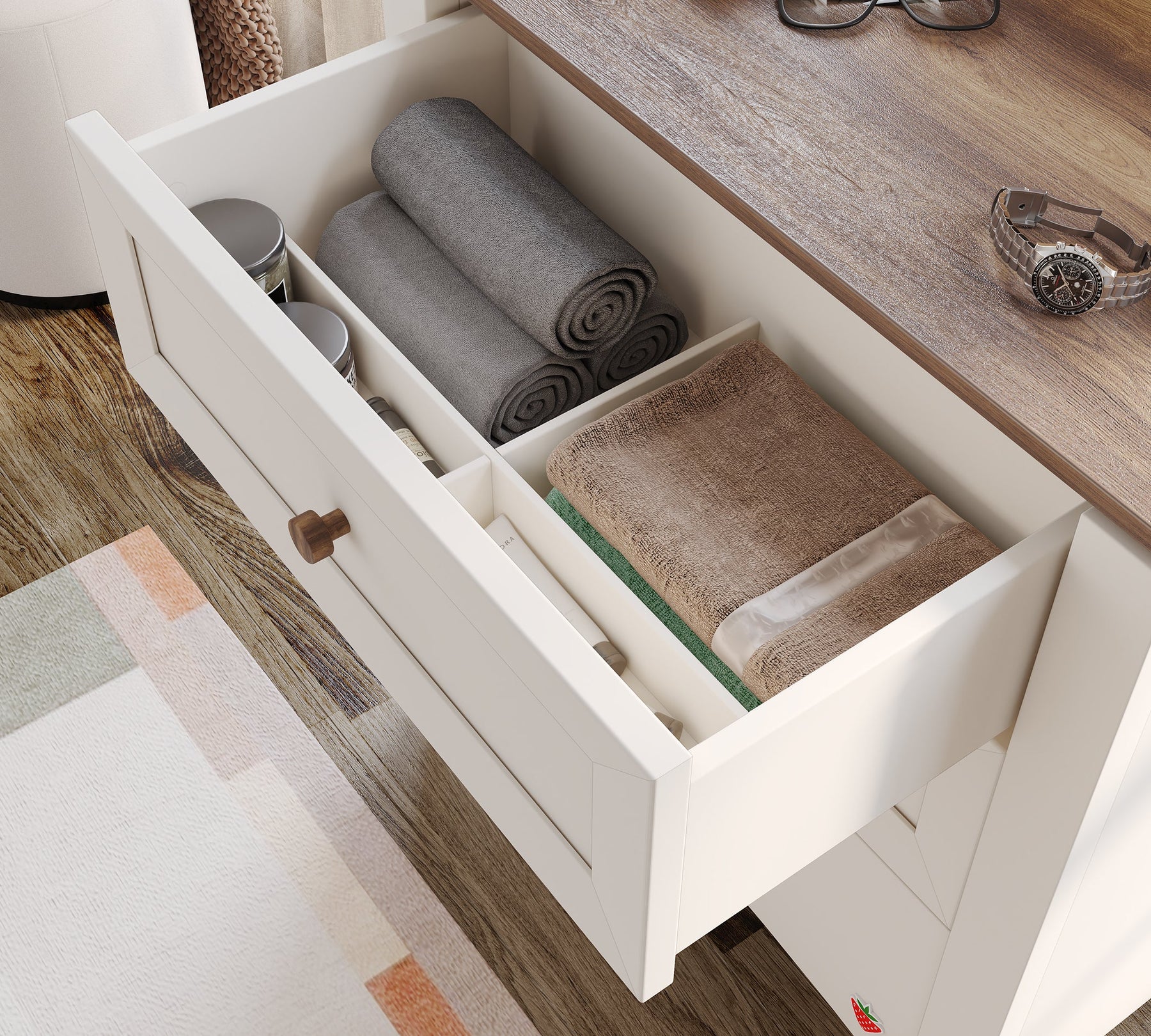 Me detajet prej druri që i japin elegancë, şifonyeri ofron një prekje natyrale dhe elegante me kapakët e bërë nga druri arra të dizajnuar veçmas. Të gjitha skajet janë mbuluar me lidhje të trashë 2 mm për të siguruar një përdorim të gjatë.