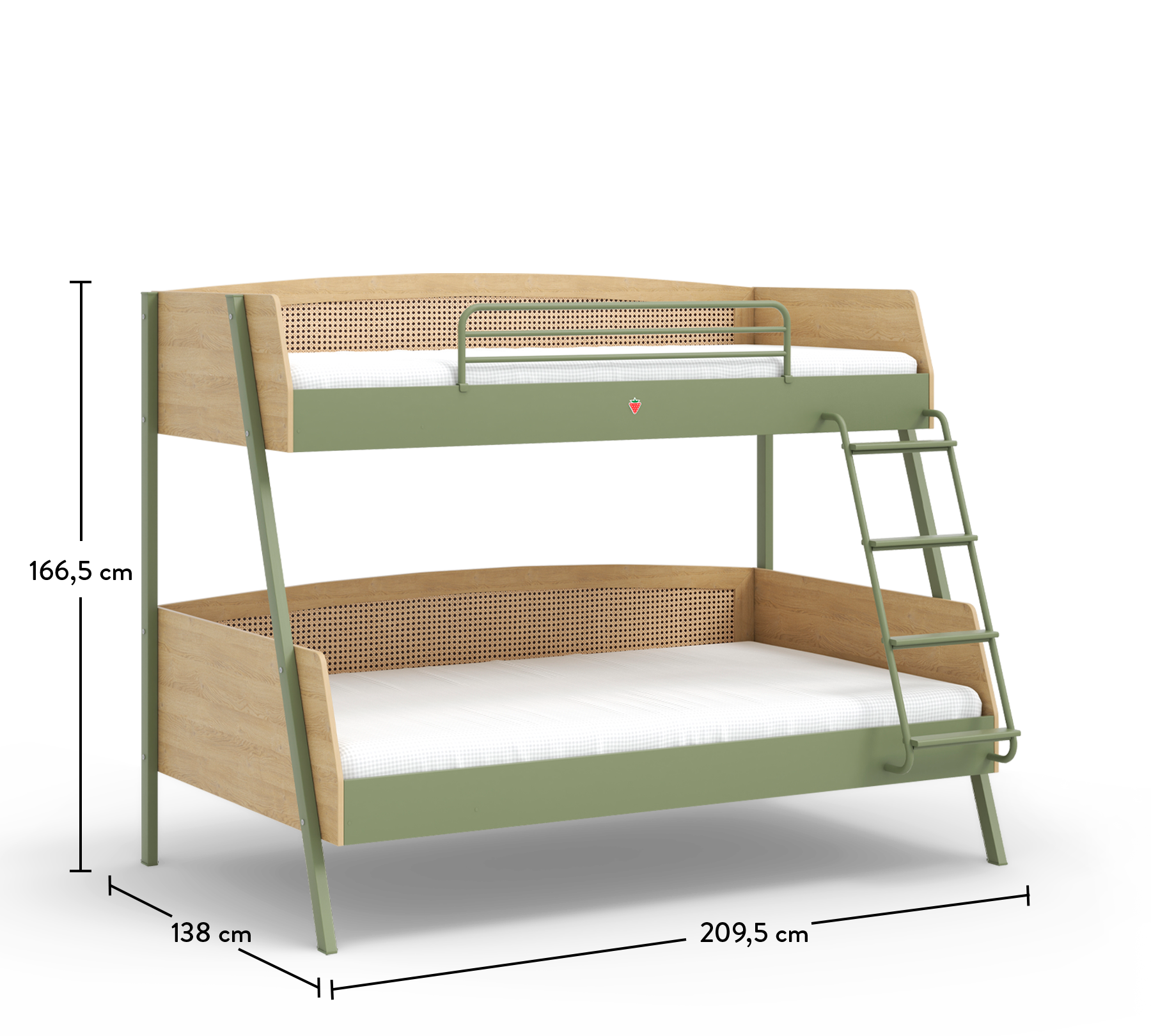 Shkallët e shkallëve të dizajnuara me teknikën e lyerjes me ngjyrë geranium me model gofrato që parandalon rrëshqitjen e këmbëve, ofrojnë përdorim të sigurt. Kapaciteti mbajtës i të dy zonave të fjetjes është 130 kg, dhe dërrasat anësore të trasha të poshtme dhe të sipërme të pasme promovojnë qëndrueshmëri. Krevati i sipërm është i përshtatshëm për fëmijët e moshës 6 vjeç e lart, krevati i poshtëm është më i përshtatshëm për fëmijët më të vegjël.