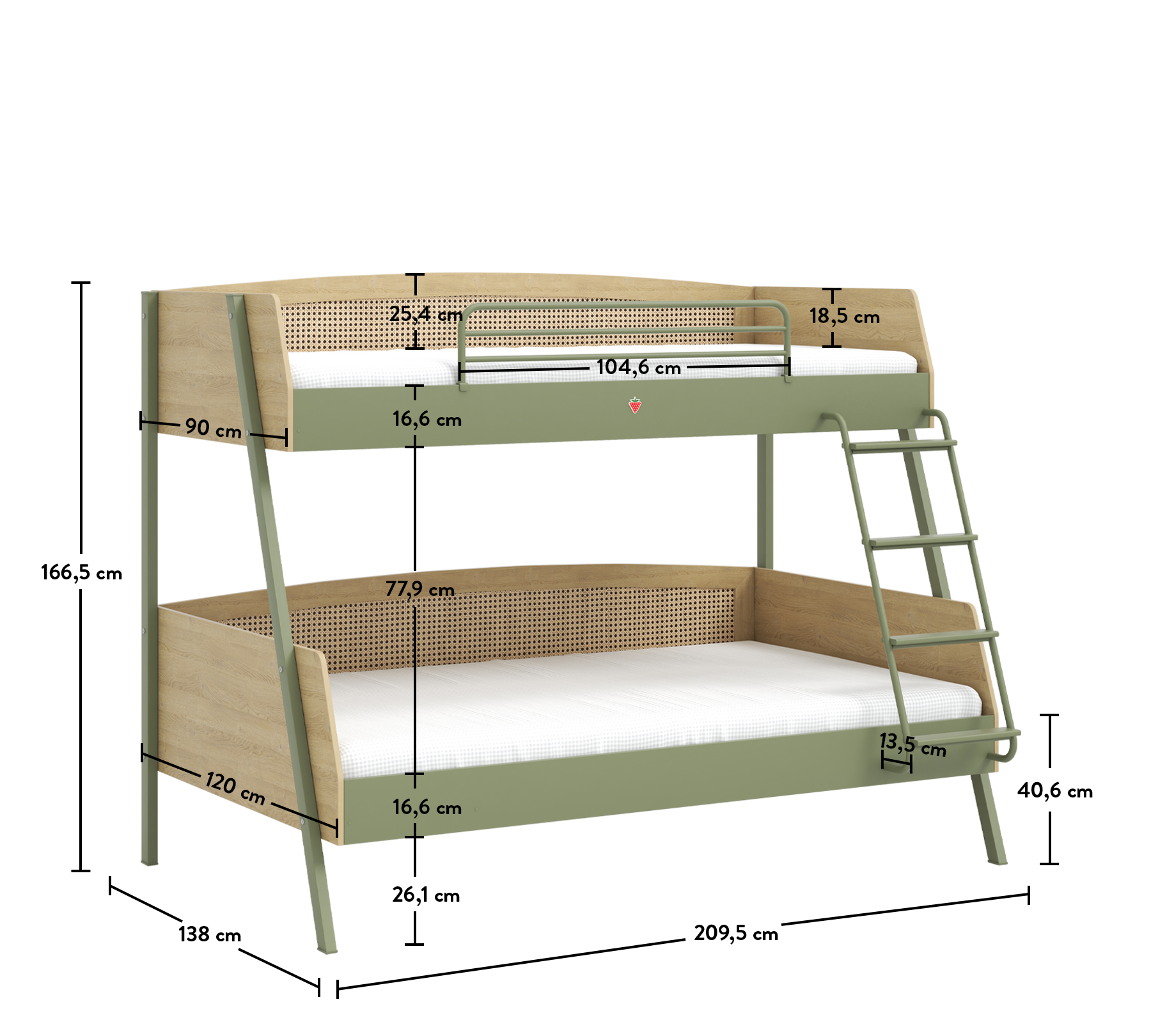 Shtrat marinari Loof i gjerë dallon nga krevate të tjera marinari me sipërfaqen e tij të madhe të shtratit të poshtëm dhe ofron një përvojë gjumi të rehatshme dhe të bollshme për adoleshentët dhe fëmijët. Ndërsa shtrati i poshtëm ofron përdorim të rehatshëm me përmasat e tij 120x200 cm, krevati i sipërm ofron një zonë ideale për të fjetur me madhësinë e tij prej 90x200 cm. Lartësia maksimale e shtratit përcaktohet si 22 cm.