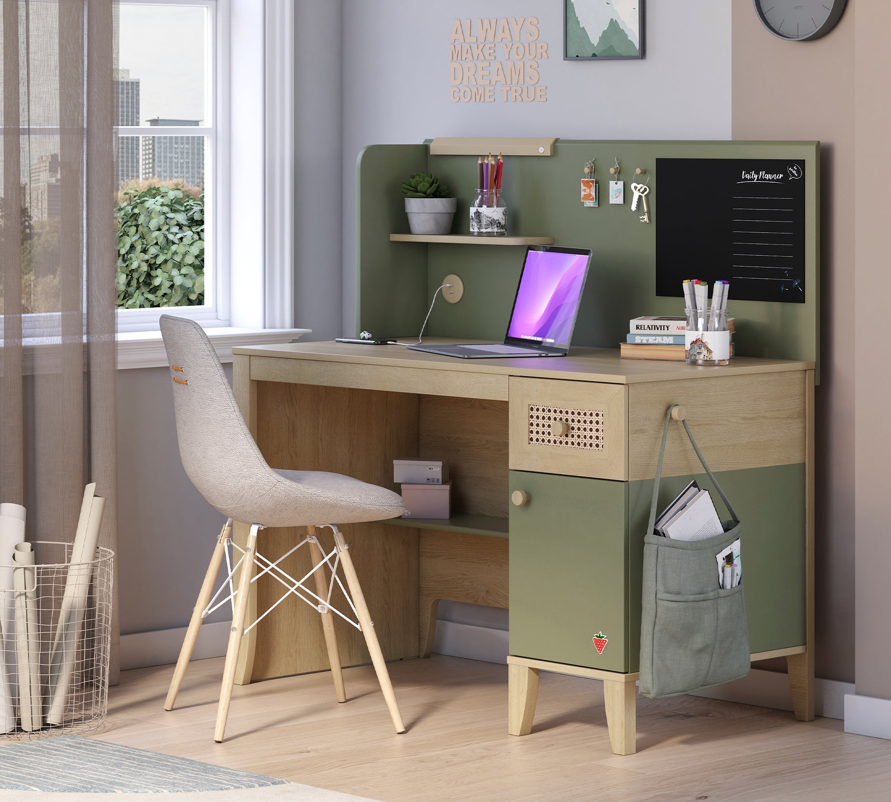 Loof Çalışma Ünitesi ka një dizajn të mahnitshëm me harmoni ngjyrash Sardunya dhe Karina.