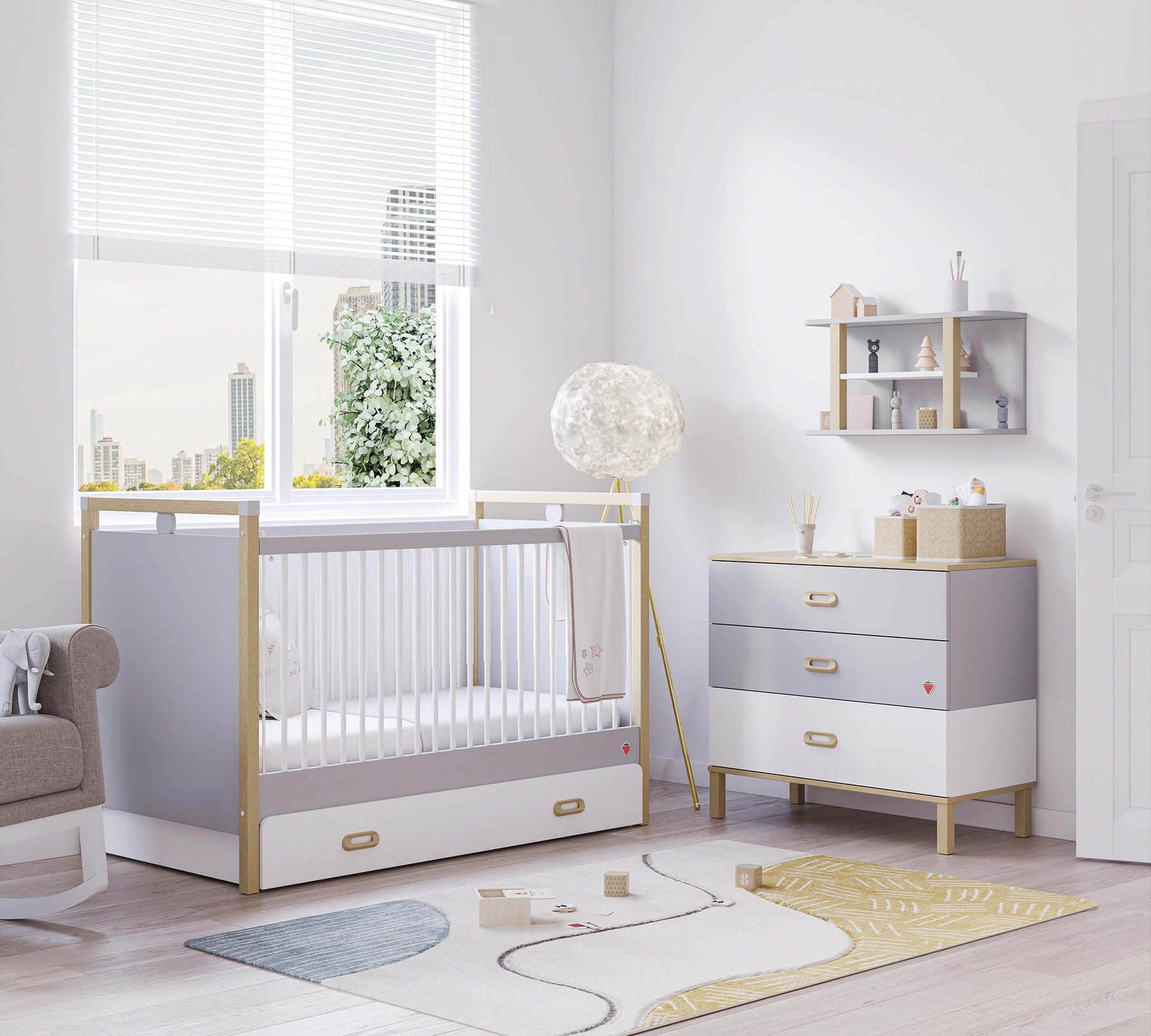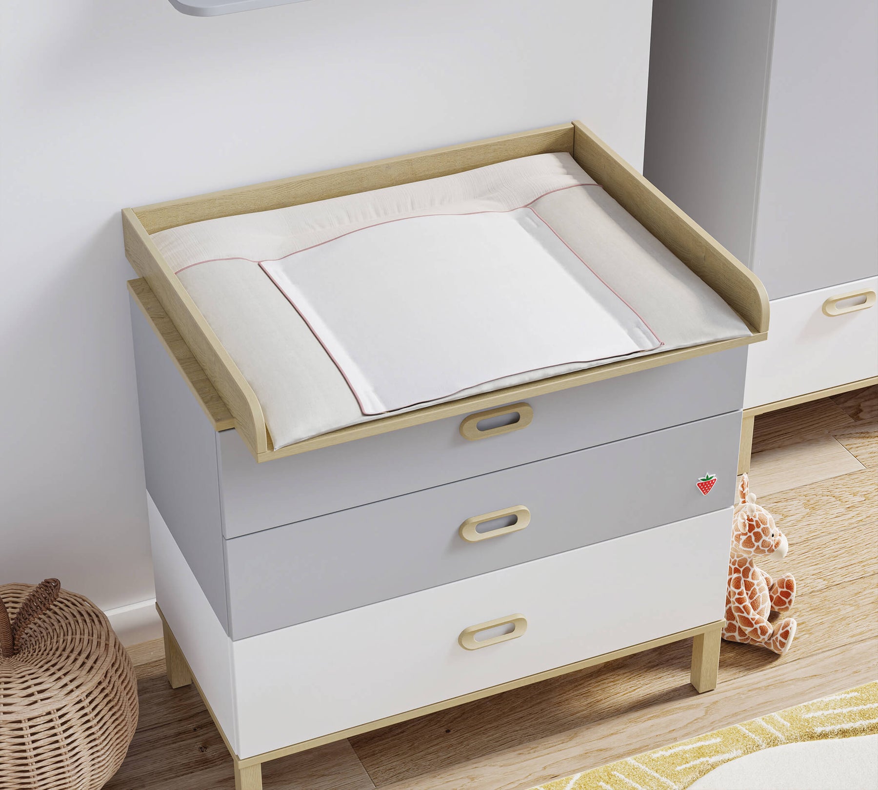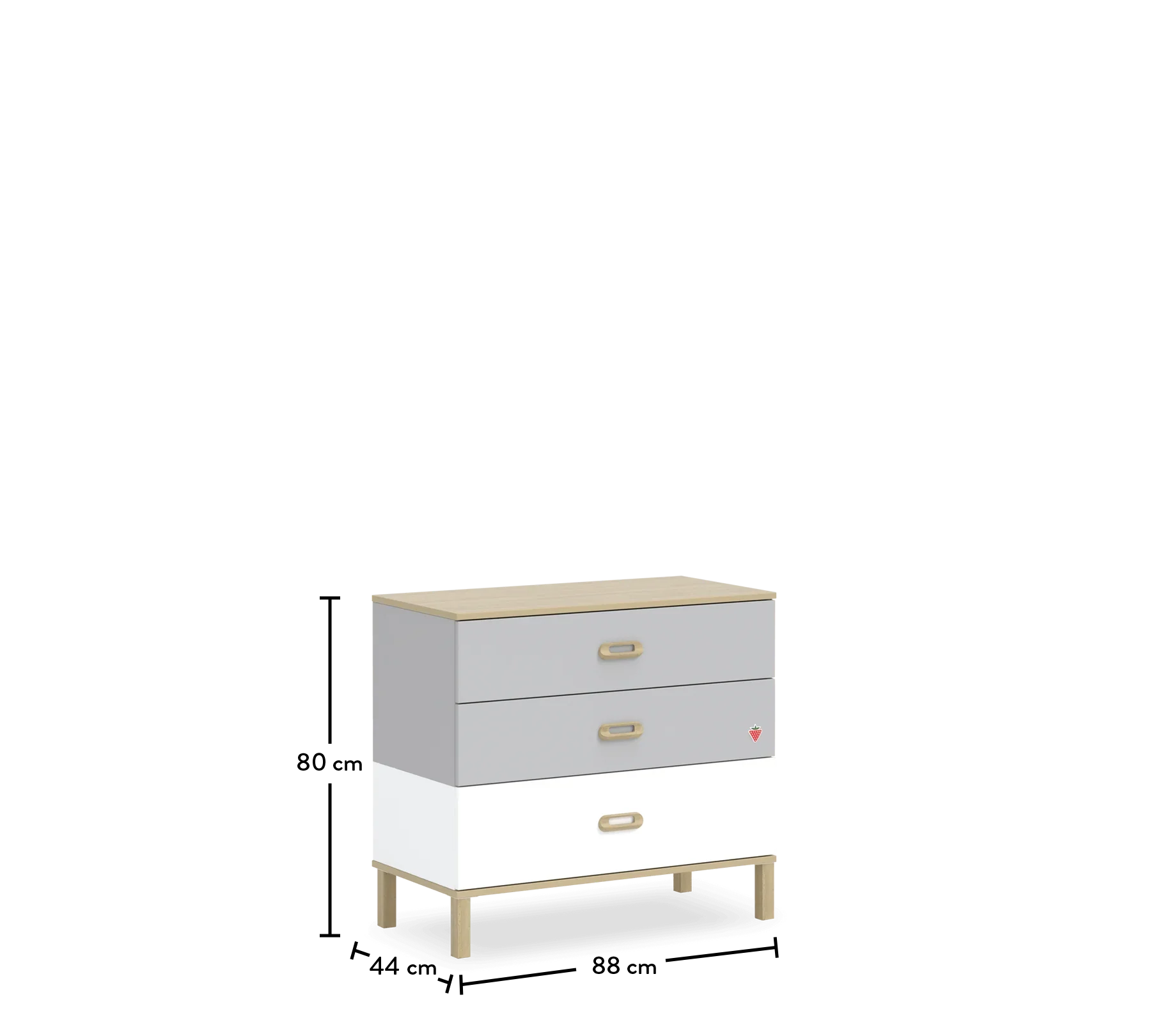Me përdorimin e ngjyrës gri në dy çekmecat e sipërme dhe të bardhës në çekmecin e poshtëm, Baby Mino Şifonyer ofron një hapësirë të rregullt depozitimi falë ndarjeve që mundësojnë grumbullimin e sendeve në çekmecin e sipërm dhe atij të mesëm. Çekmeçet, të pajisura me pista dhe mente nga markat më të njohura në botë, ofrojnë një mundësi përdorimi të sigurt dhe të qetë.