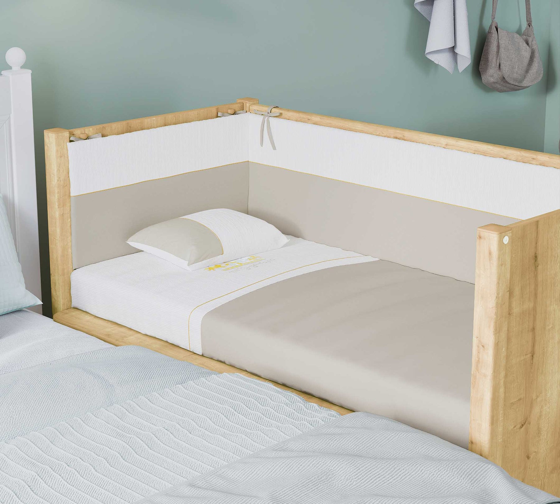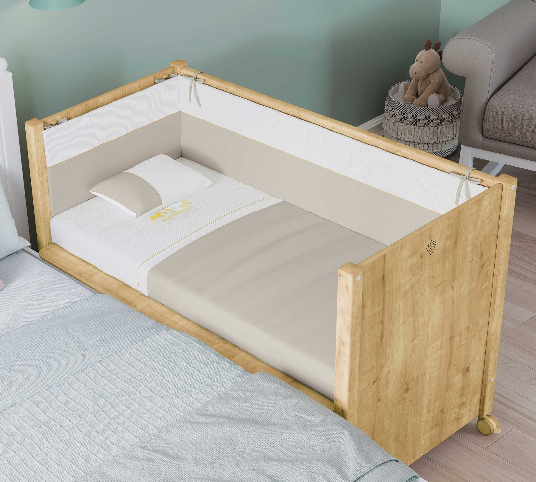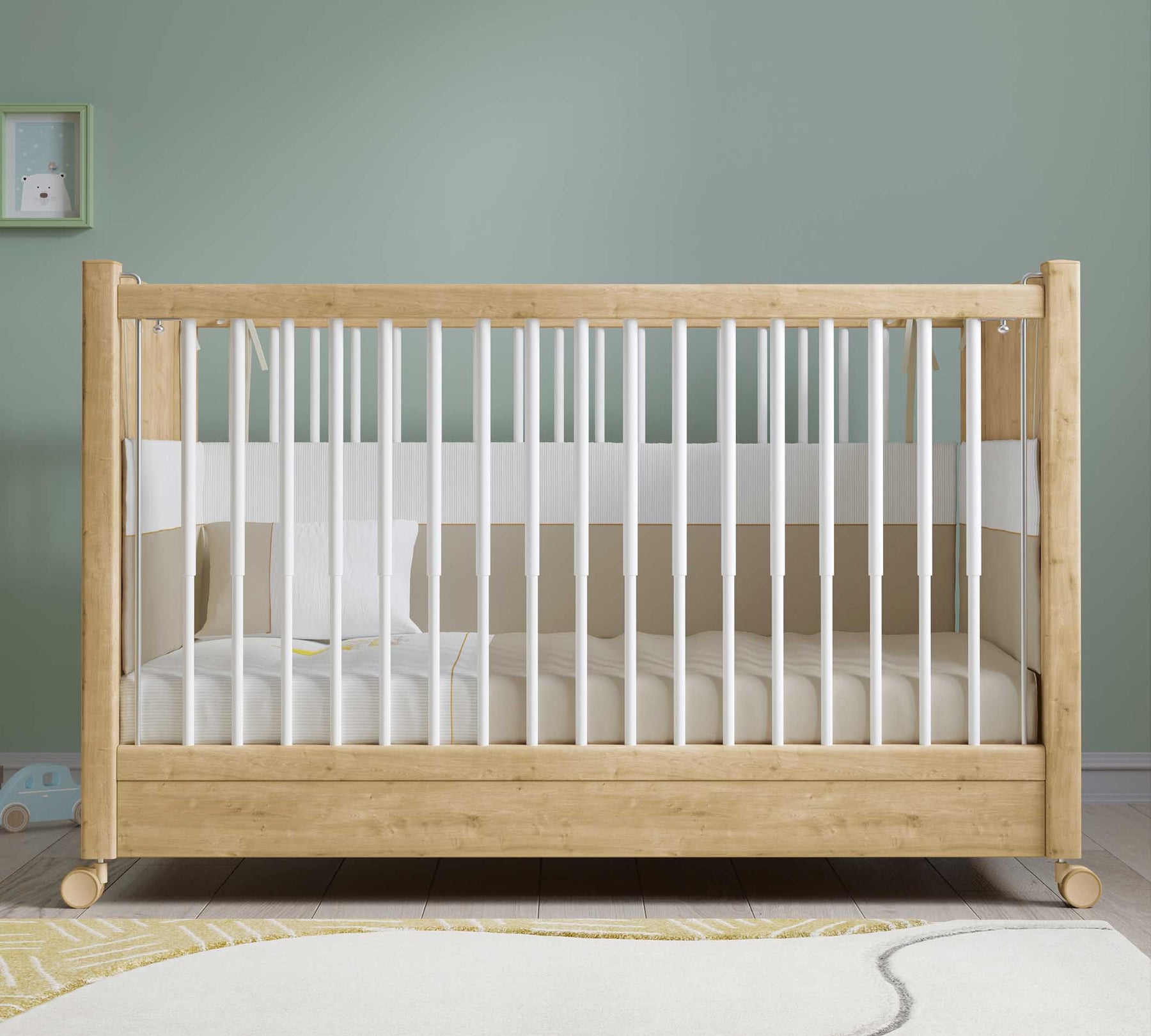Shtretër bebesh me rrota; Përveç përdorimit praktik me 4 rrotat e tij rrotulluese 360°, ai ofron avantazhin e përdorimit shumëfunksional me kangjella e ashensorit që i lejon nënës të arrijë lehtësisht tek fëmija i saj. Dy nga rrotat me frena u instaluan për të siguruar qëndrueshmërinë e shtratit të foshnjës. Falë rrotave, produkti mund të zhvendoset lehtësisht dhe të përdoret kudo në dhomë.