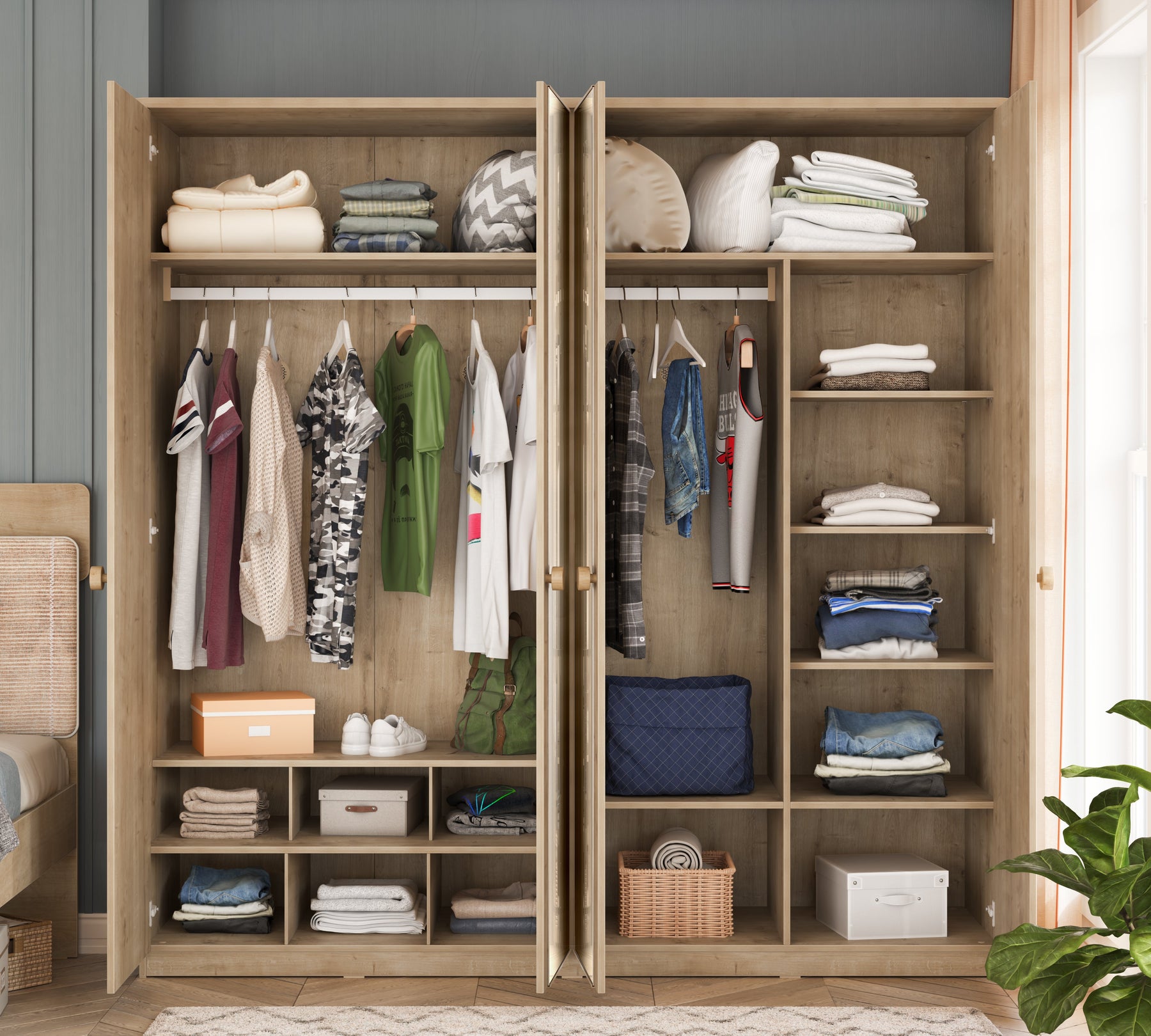 Rregulli i raftit që i jep dimension menaxhimit të hapësirës dhe dizajni minimal me detaje të hequra Garderoba Mocha me 4 Dyer, ofron zgjidhje që do të kënaqesh të përdorësh në dhomat e rinisë. Dy pasqyra me trup druri natyral, një sasi e gjerë për varëse rrobash dhe sistemi i derës që mbyllet në heshtje e lehtëson posedimin e një mobiljeje kompak. Dera e garderobës hapet dhe mbyllet lehtë dhe në heshtje përmes karakteristikës së montimit ngadalësues. Gjithashtu është shumë e sigurt ndaj aksidenteve/kapjeve të mundshme. Me këtë dollap, që përmban teksturat e buta të drurit në çdo detaj, mund të mbash të gjitha rrobat e tua të dëshiruara në dorë, pa pasur nevojë të rregullosh rrobat për çdo stinë.