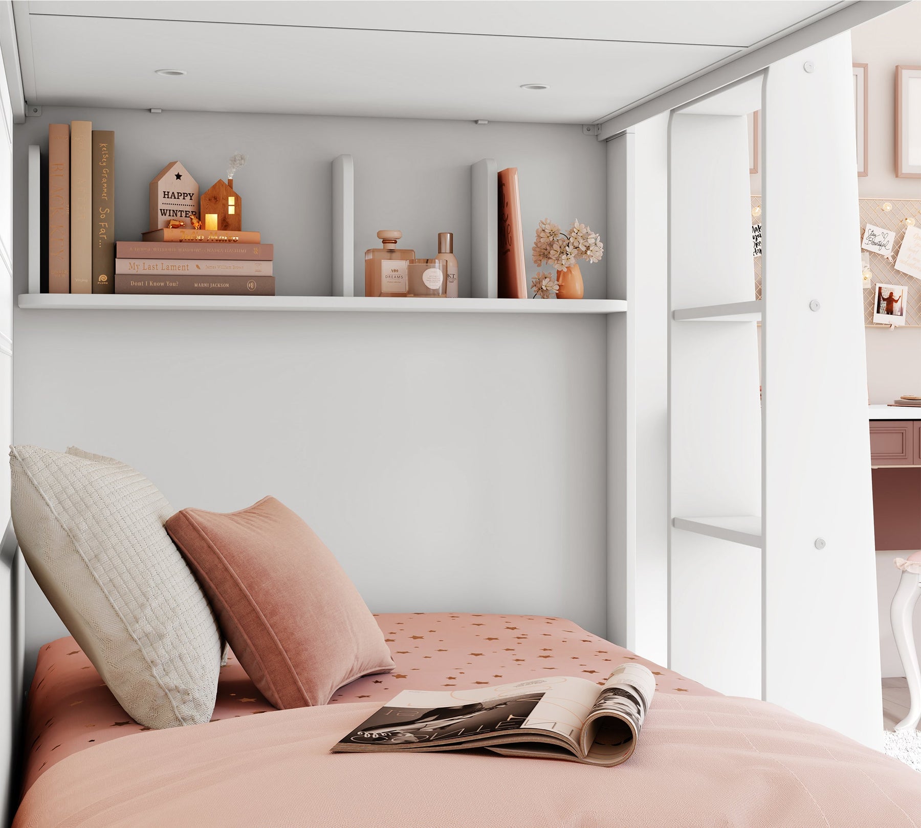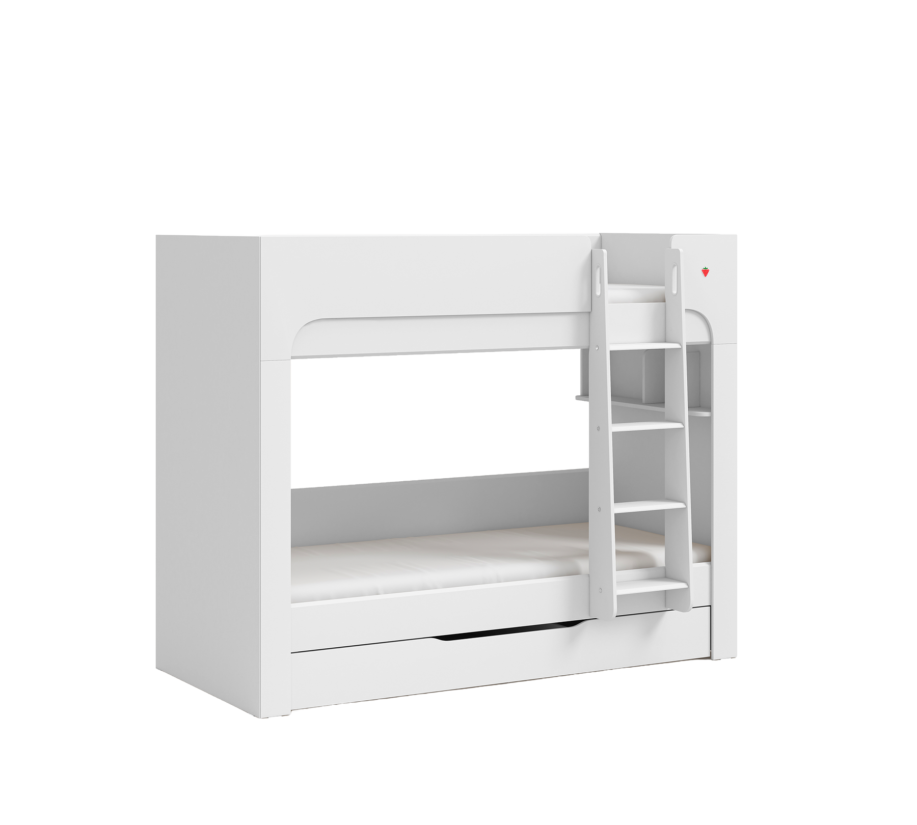 Përshtatet me një krevat 90x200 cm (sipër/poshtë). Maks. ngarkesa për çdo hapësirë krevati është 130 kg. Aplikime këndore të buta në çati dhe bashkime 45°. Nën krevati me 3 pjesë.