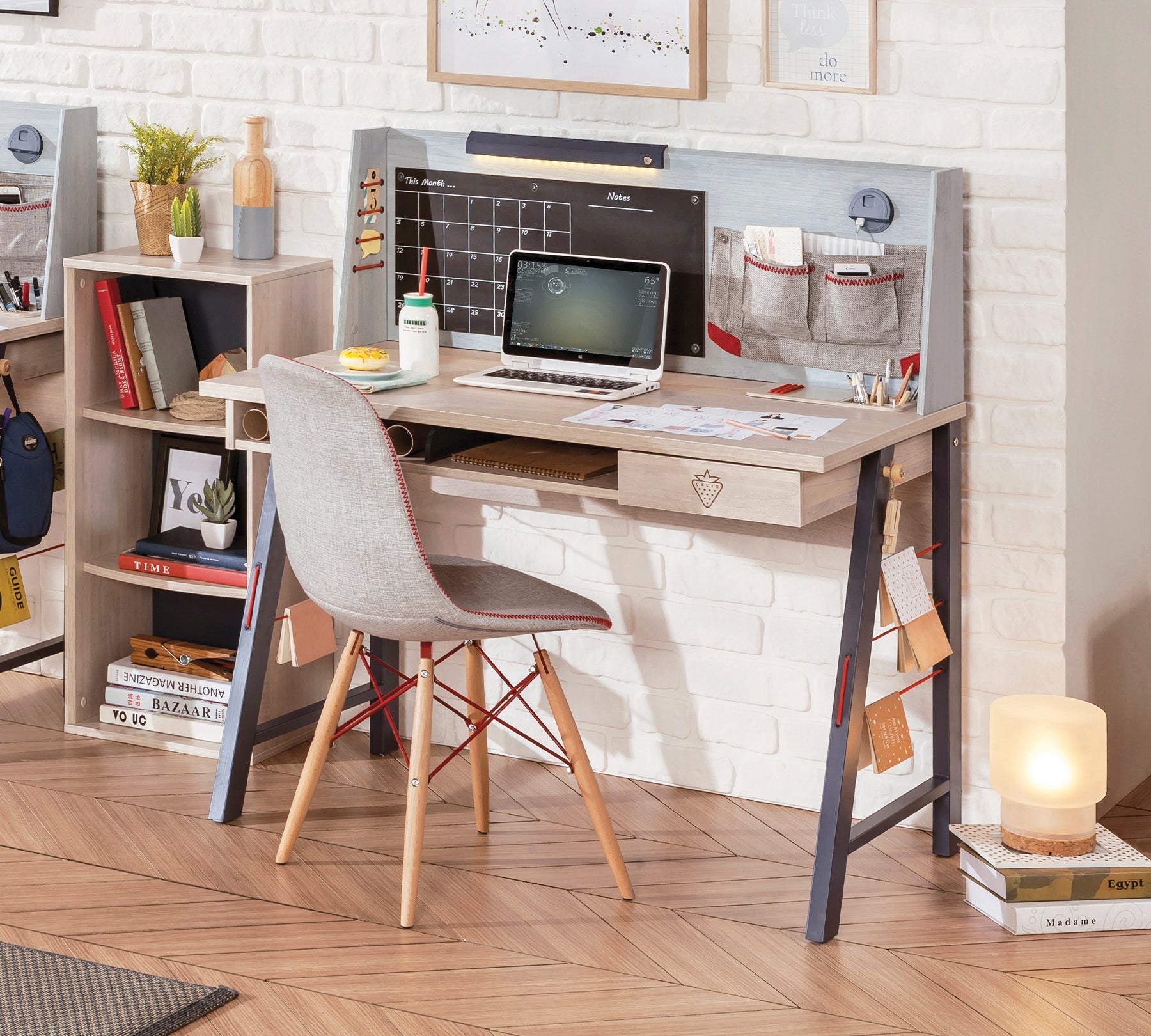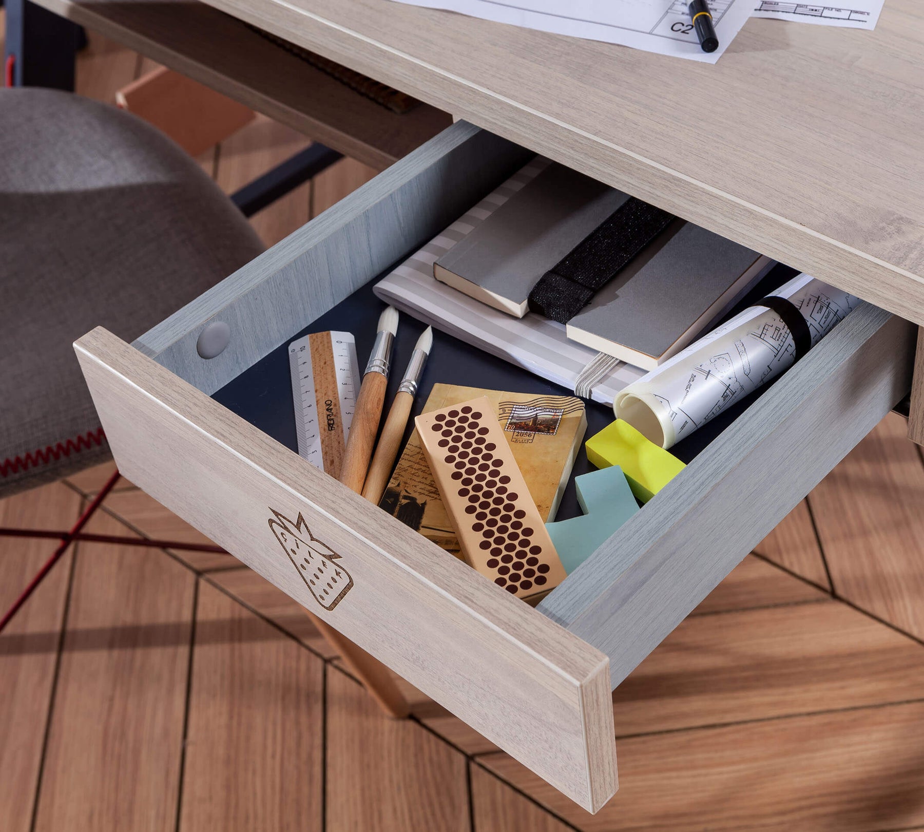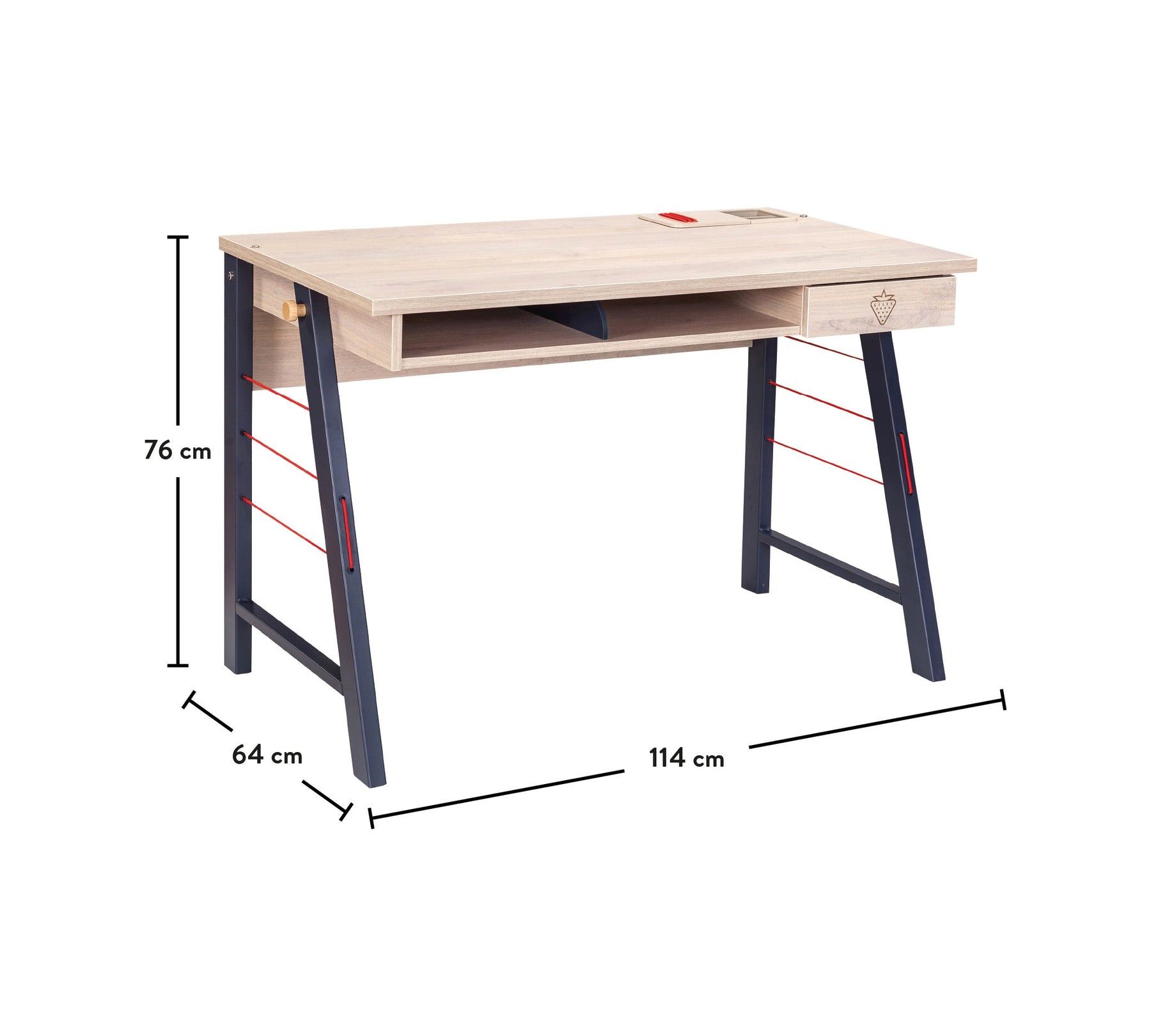 Trio tavolin pune e mesme, e cila ofron një pamje të dobishme dhe të rregullt tavoline me kontejnerin e saj të mbeturinave dhe mbajtësen e lapsave, ka një dizajn me të cilin të rinjtë kënaqen të kalojnë kohë.