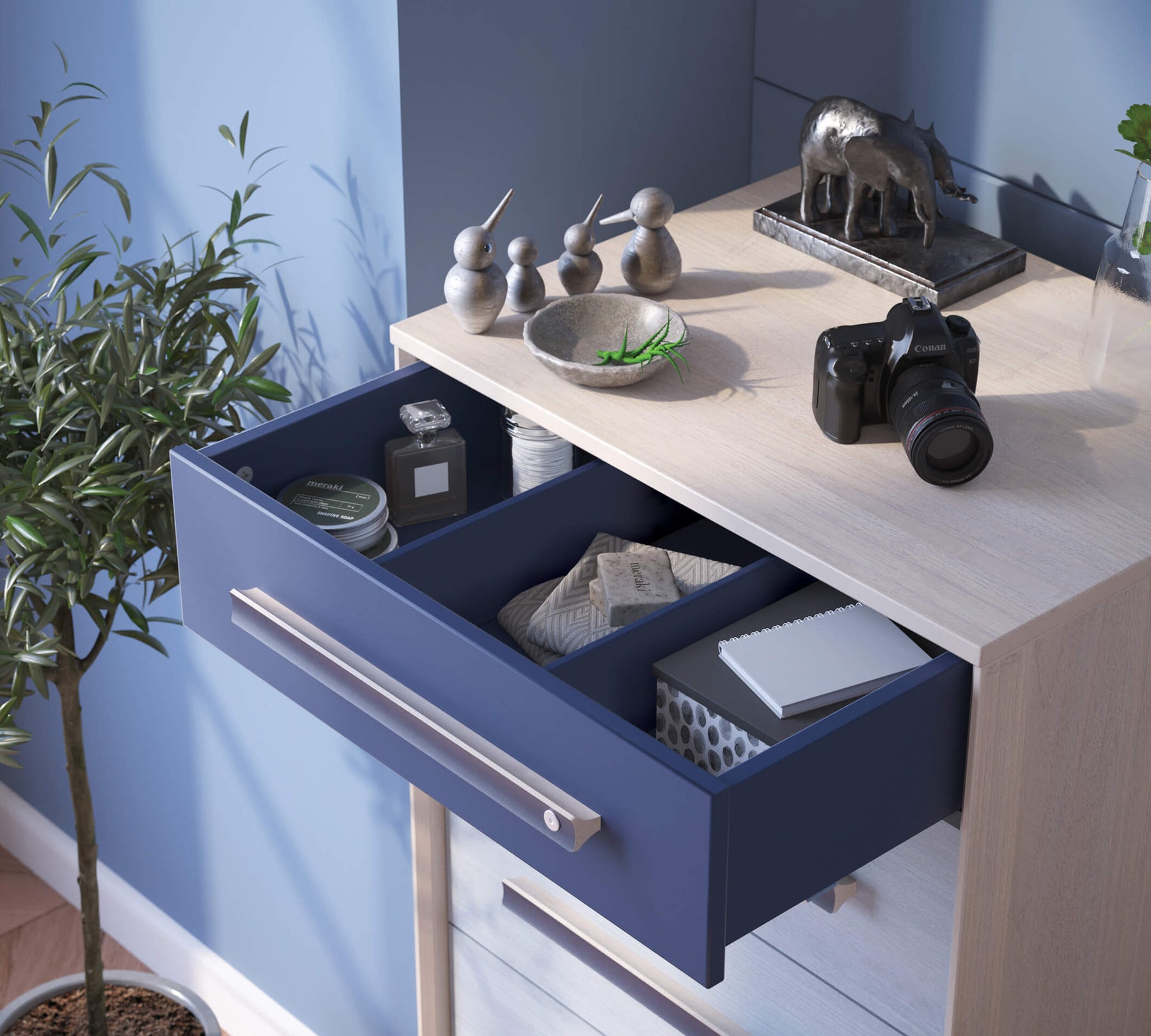 Duke shtuar rehati unike në hapësirat e banimit të të rinjve, Trio Komodë e gjatë ofron një hapësirë ​​të veçantë magazinimi me sirtarët e tij të dobishëm. Trio Komodë e gjatë, i cili ka një veçori të pavarur plotësuese për veshjet e të rinjve dhe sendet personale, përbëhet nga 5 sirtarë. Ndarjet brenda sirtarëve ndihmojnë në përdorimin më efikas të volumit të brendshëm kur vendosni sende. Falë sistemit të tapave të përdorur në sirtarë, të rinjtë mund ta hapin dhe mbyllin sirtarin në heshtje dhe të sigurt.