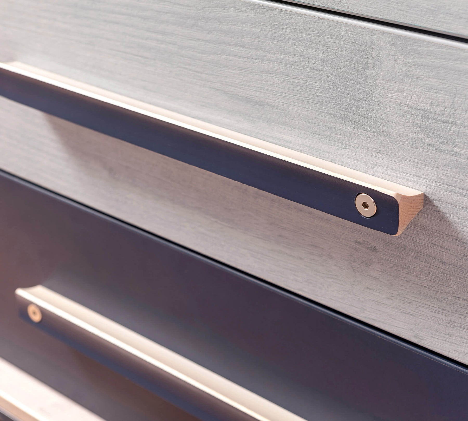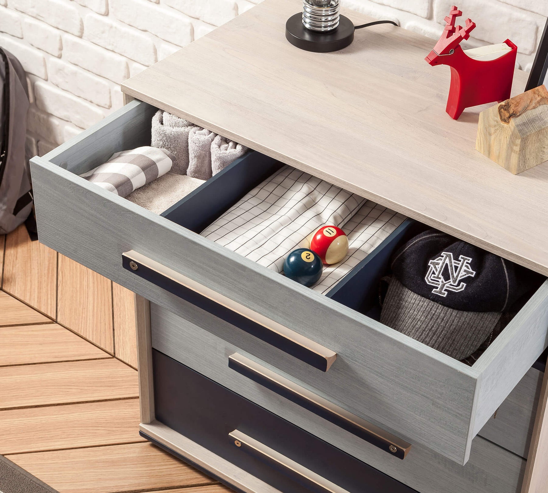 Arrinë një pamje estetike dhe plot stil me harmoninë e ngjyrave gri të hapura dhe blu të errët. I zhvilluar për të organizuar gjërat e të rinjve, Komoda Trio bëhet një nga mobiljet më të përdorura në dhomat e të rinjve falë dizajnit të tij funksional.