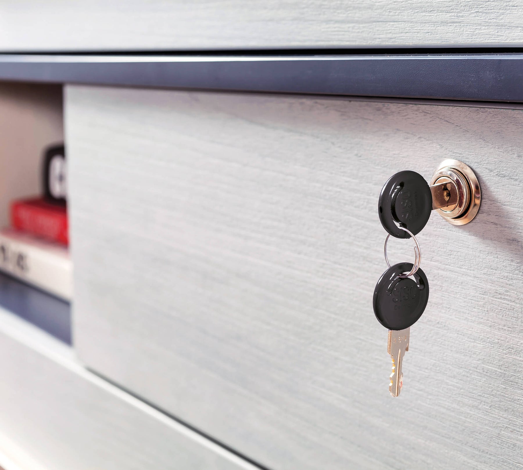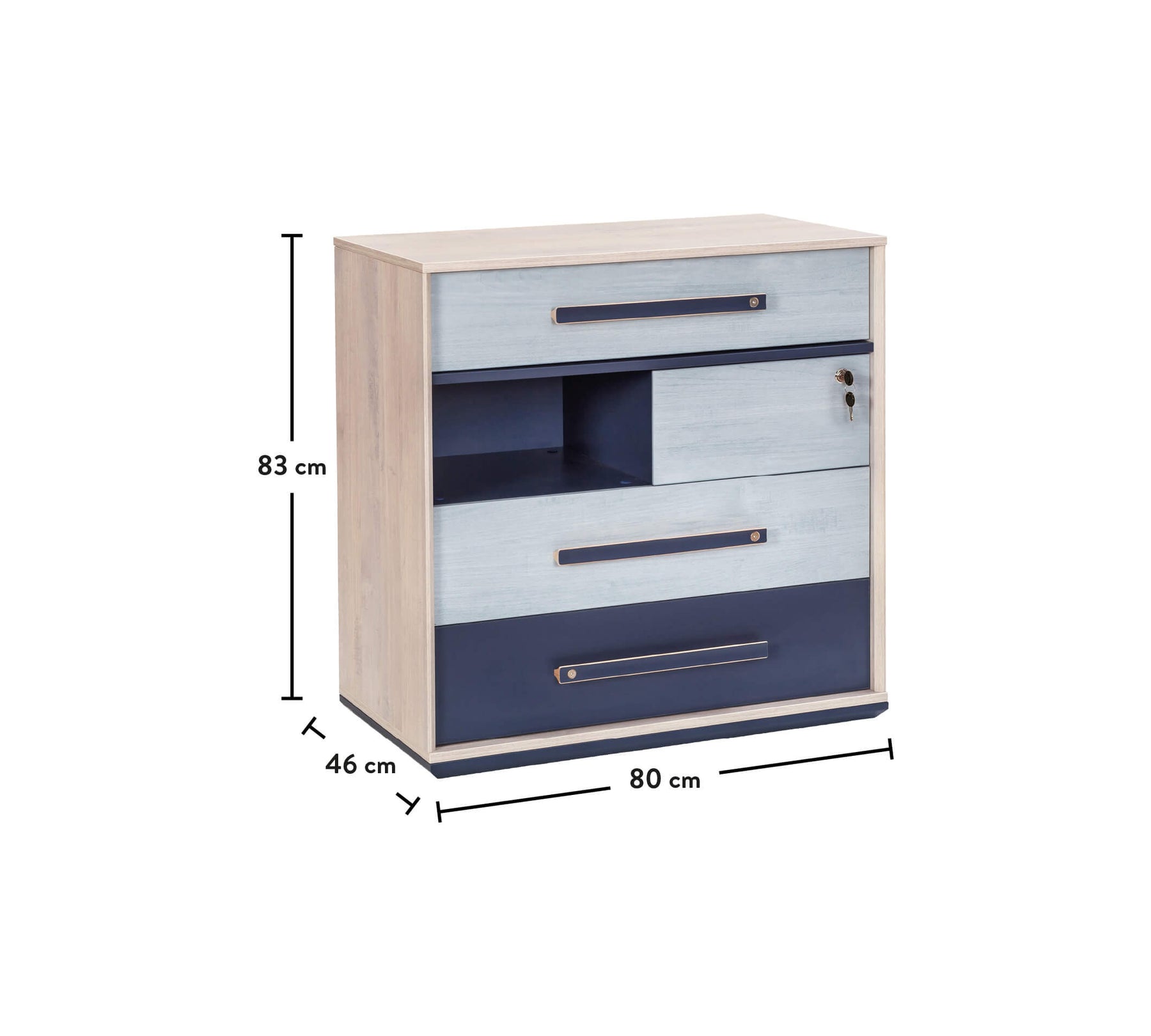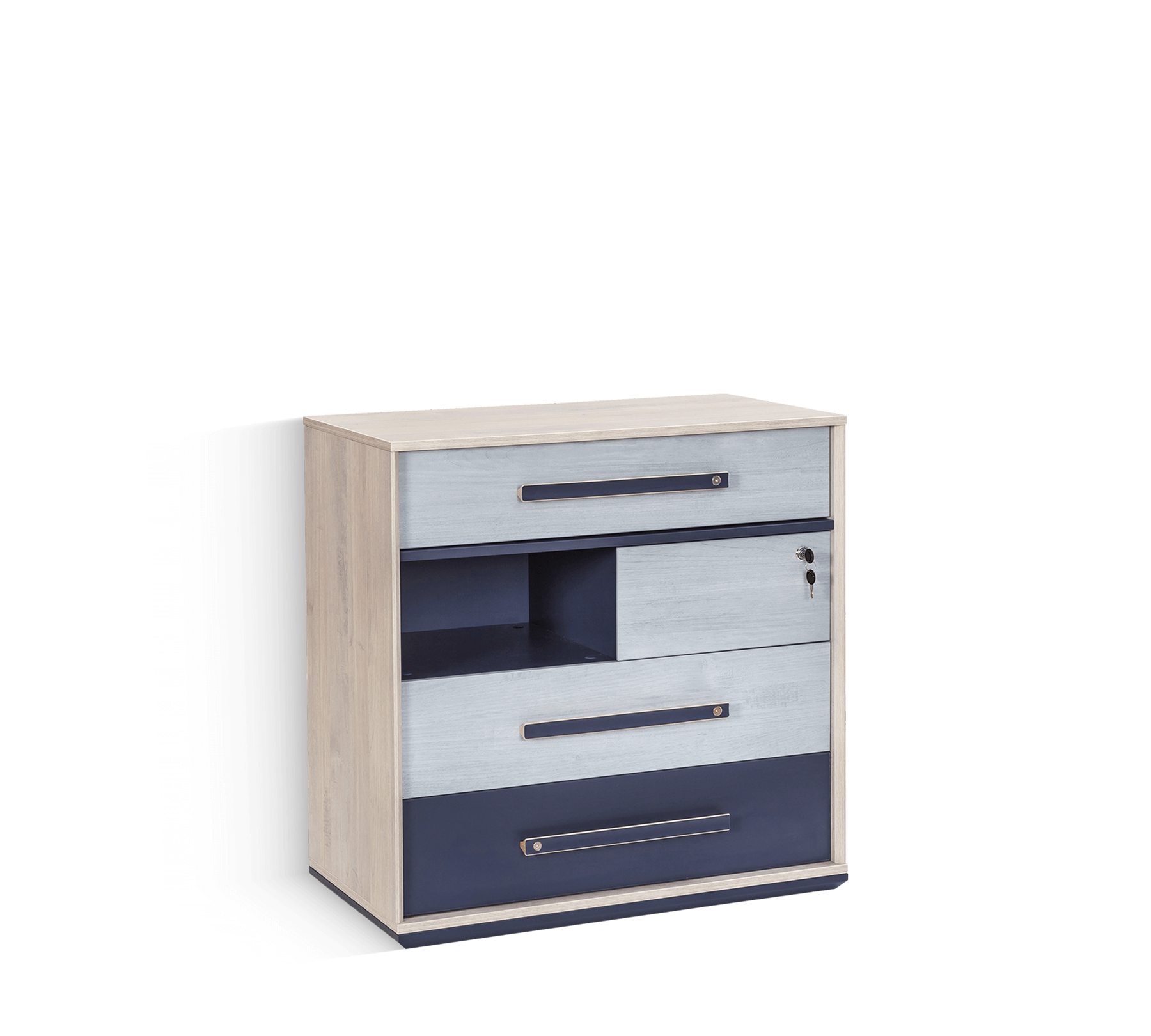 Duke sjellë një atmosferë të gjerë në ambientet e jetesës së të rinjve, Komoda Trio tërheq vëmendjen me dizajnin e tij të thjeshtë dhe modern. Komoda Trio me 4 sirtarë, e cila përdoret për organizimin e sendeve personale, ka edhe 1 sirtar të kyçur.