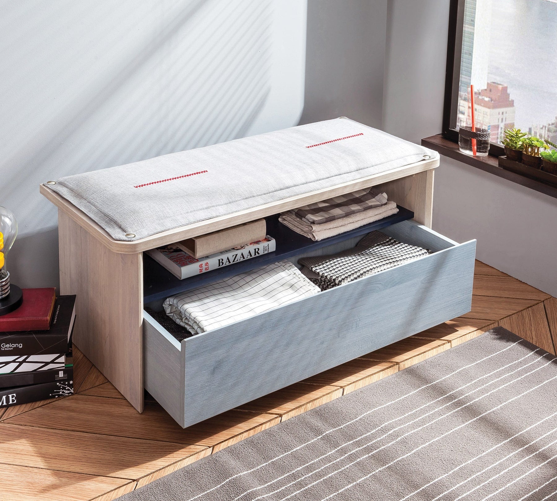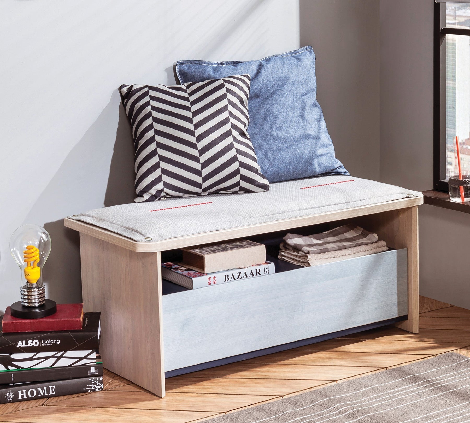 Minderi temizlemek için çıt çıtları sayesinde kolaylıkla söküp tekrar takabilirsin. Sadece bir puf olarak değil, yeri geldiğinde düzenleyici olarak da kullanabileceğin çekmeceli puf, uyumlu modüllerle birlikte alana bütünlük katar.