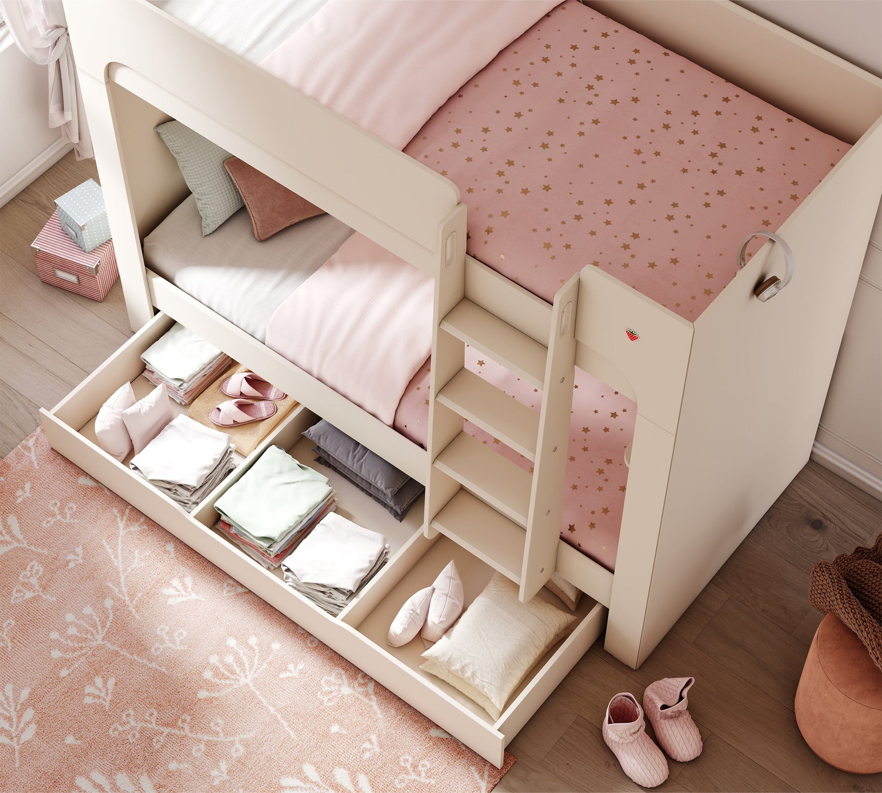 Varia Dar Ranza, dizajni kompak të saj e përdor hapësirën në mënyrë efikase në dhomat e vogla, ndërsa struktura e saj e fortë dhe detajet e sigurisë e bëjnë atë zgjedhjen e parë për familjet. Me përmasat 90x200 cm, ofron një hapësirë të gjerë për gjumë si lart ashtu edhe poshtë. Krahët anësorë, shkallët dhe linjat e rrumbullakosura sigurojnë përdorim të sigurt për fëmijët.