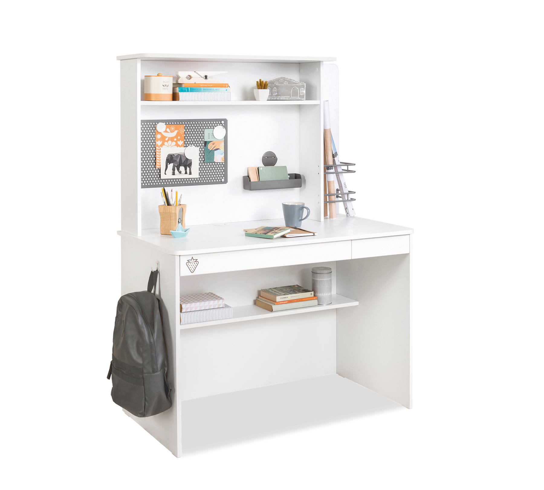 Raftet dhe ndarjet për stilolaps që e bëjnë modulin funksional e ndryshojnë njësinë e punës së bardhë nga të tjerat. Dizajni me dimensionet ideale 108x72x29 cm, është një nga modulet më të dobishme për dhomat e rinisë dhe fëmijëve.