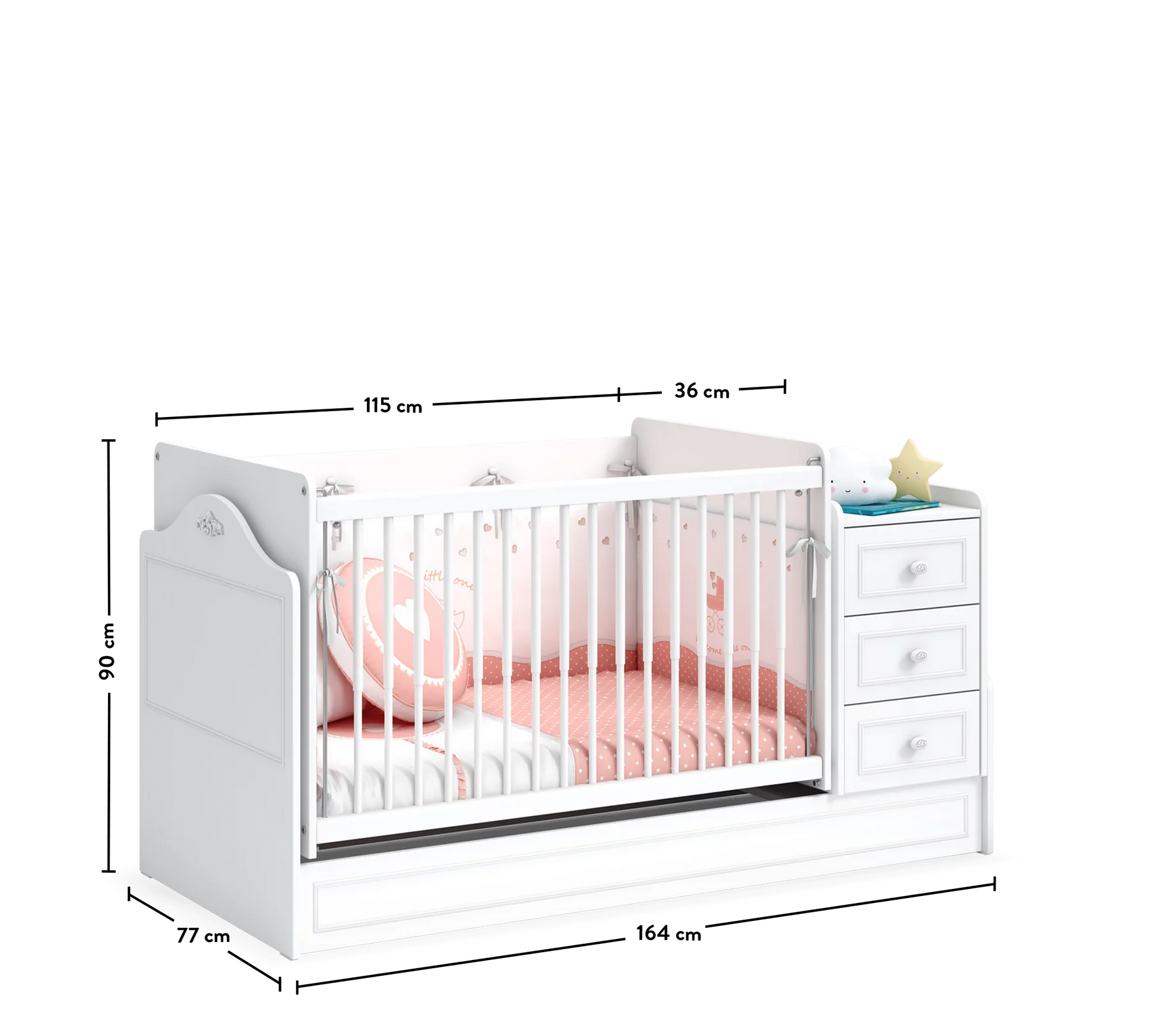 Pjesa modullore e dizajnuar duke mbajtur në mend funksionalitetin, përmes gardhit me ashensor teleskopik e bën më të lehtë arritjen e nënës tek foshnja e saj, ndërsa pajisja për gjungje mund të fijsohet në dy anët kur të dëshirohet. Kur produkti zgjatet, pjesa e gardhit mund të përdoret si tavolinë pune, ndërsa seksionet me sirtar dhe raft mund të shërbejnë si komodinë ose hapësirë të gjerë për ruajtje.