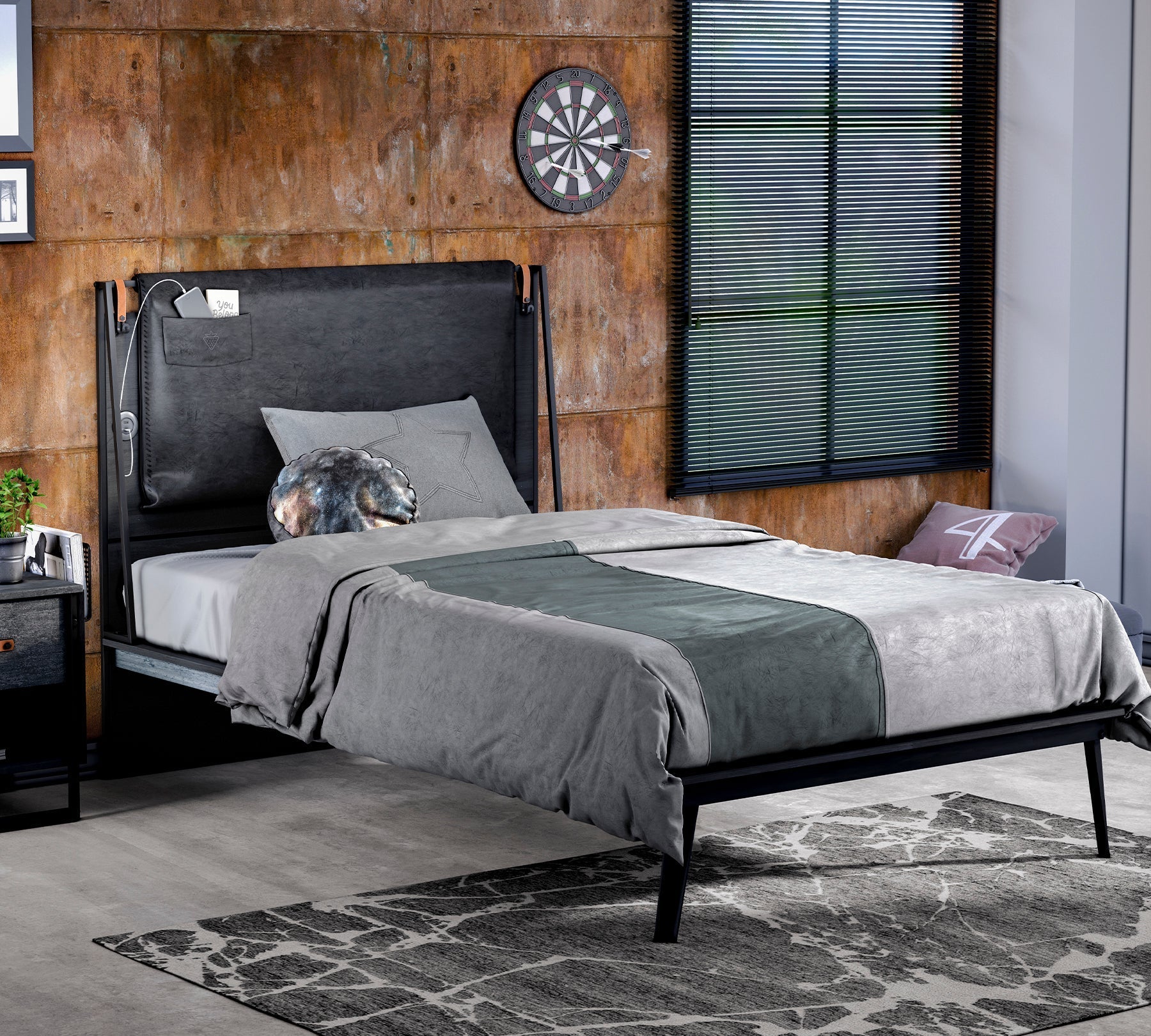 Kreu i Linjës së Metalit të Errët i jep një prekje të sinqertë dhomave të rinisë me dizajnin e tij të thjeshtë dhe kreun me funksione teknologjike.