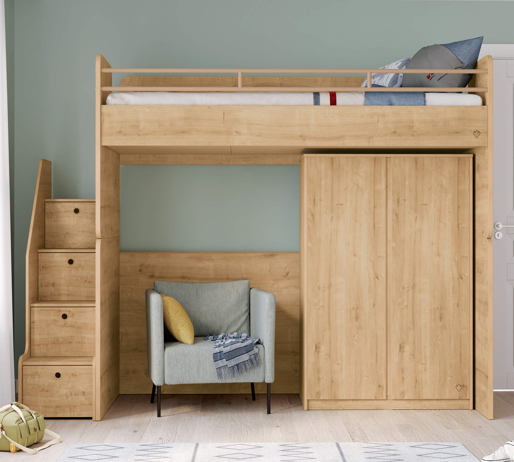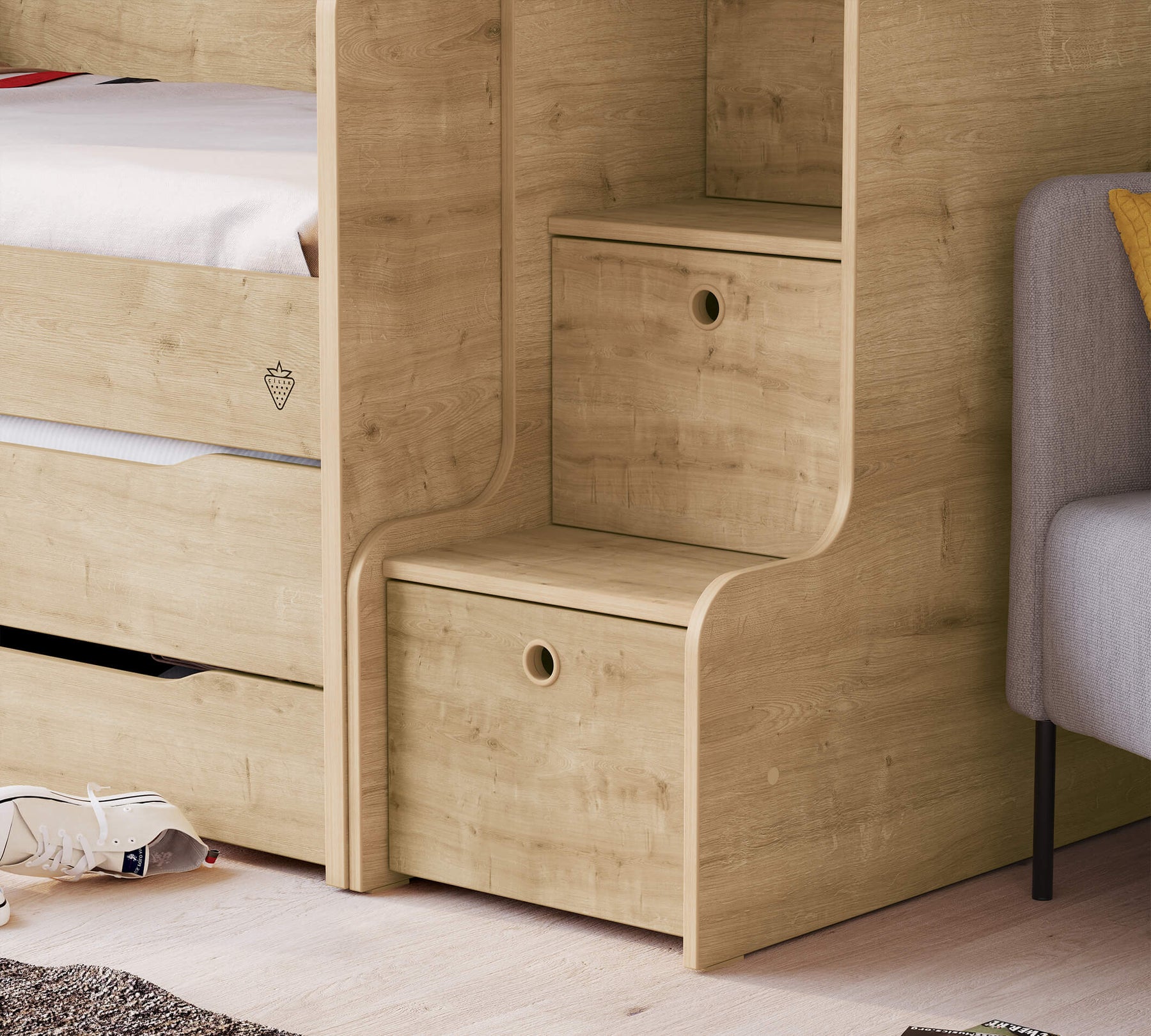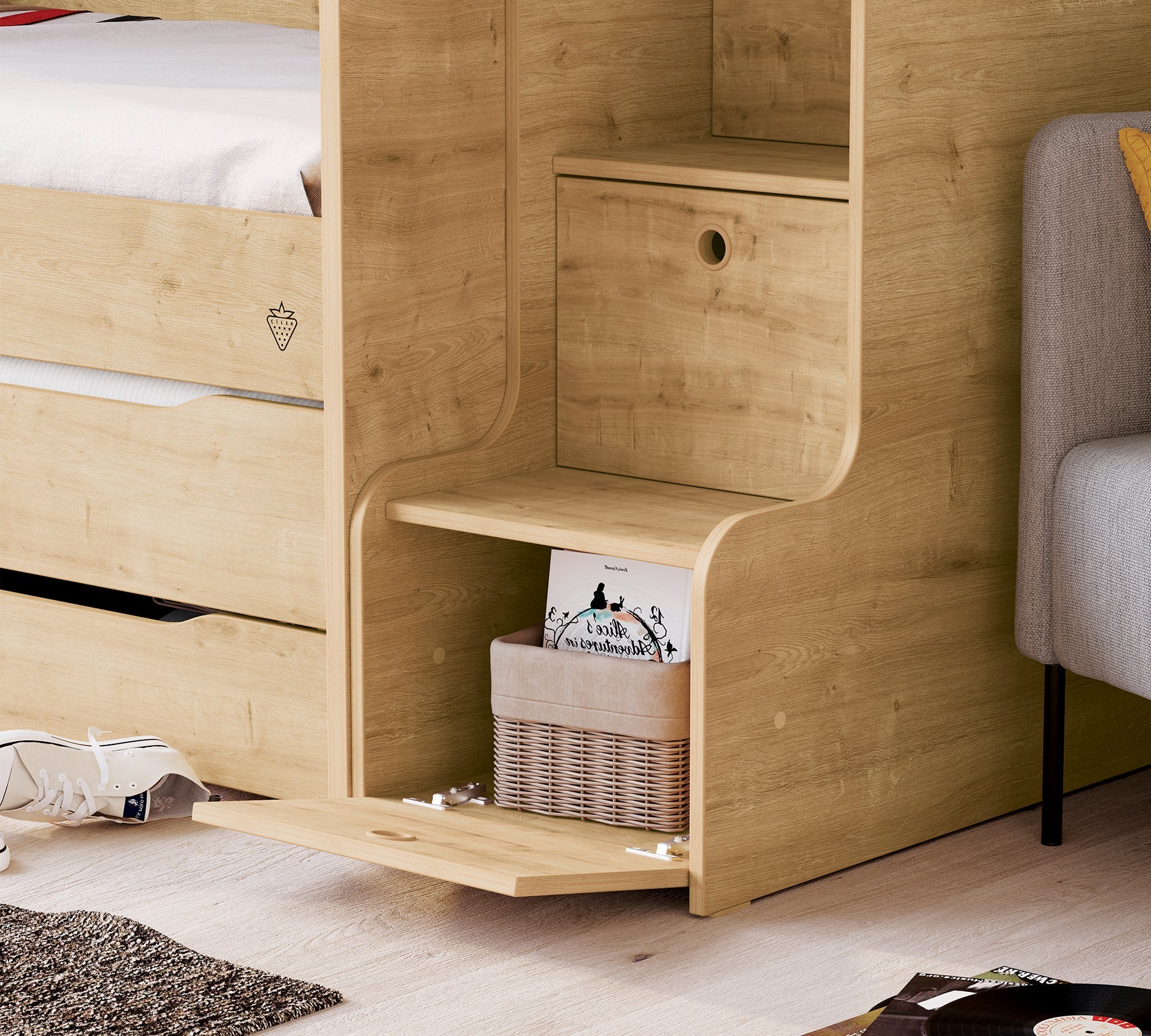 Studio Mocha Shkallë me kapaka, e cila i përket serisë Studio që mund të përdoret në mënyrë modulare, shquhet për funksionalitetin e saj si dhe elegancën e dizajnit të saj. Kjo shkallë, e cila vepron si lidhëse nëse shtretërit e sipërm dhe të mesit të studios përdoren së bashku, mund të përdoret edhe vetëm.