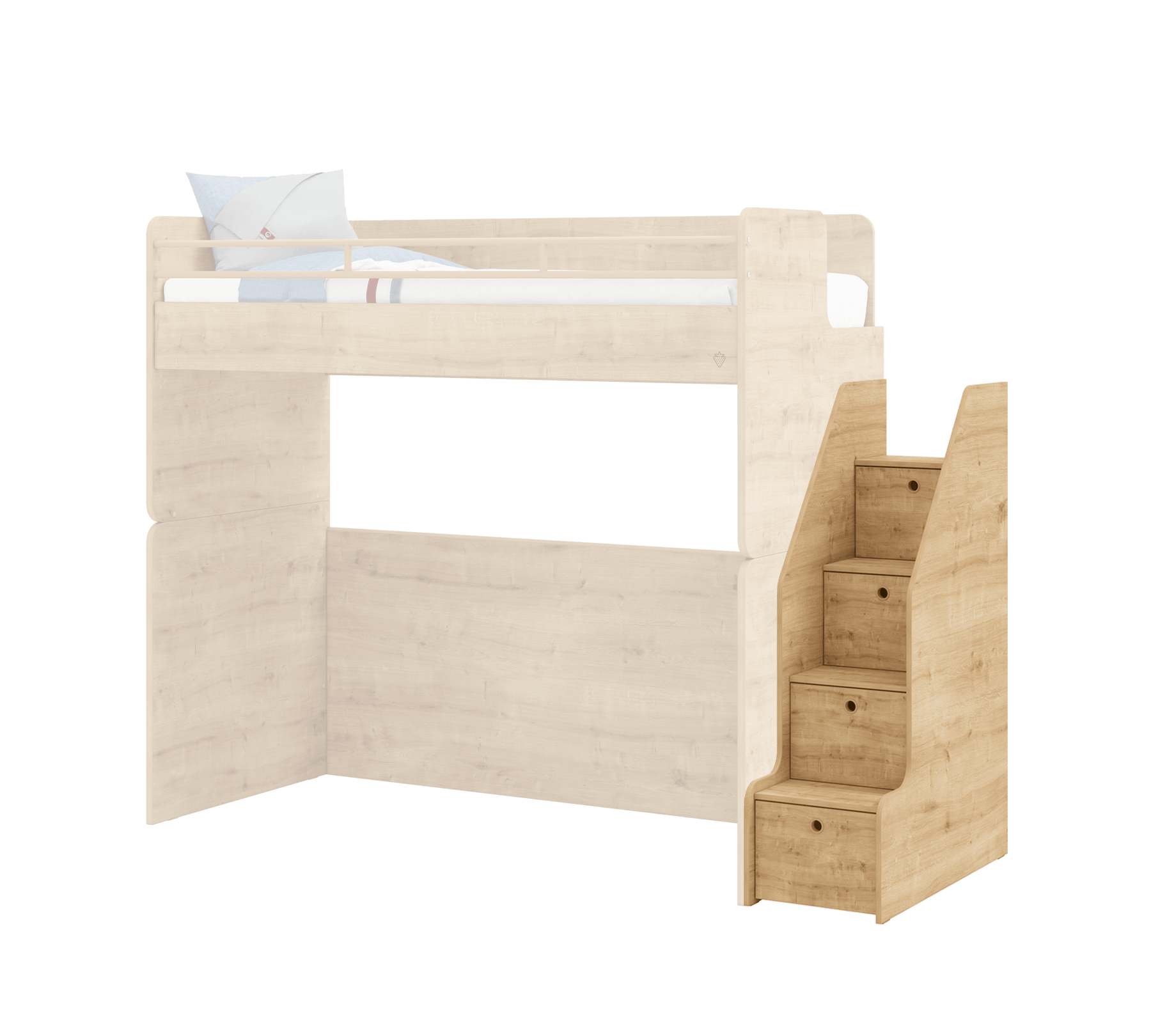 Shkallët e mbuluara në studio, e cila mund të montohet nëse krevati i sipërm dhe i mesëm përdoren së bashku, mund të përdoret në të djathtë ose në të majtë të shtretërve, në varësi të preferencës.