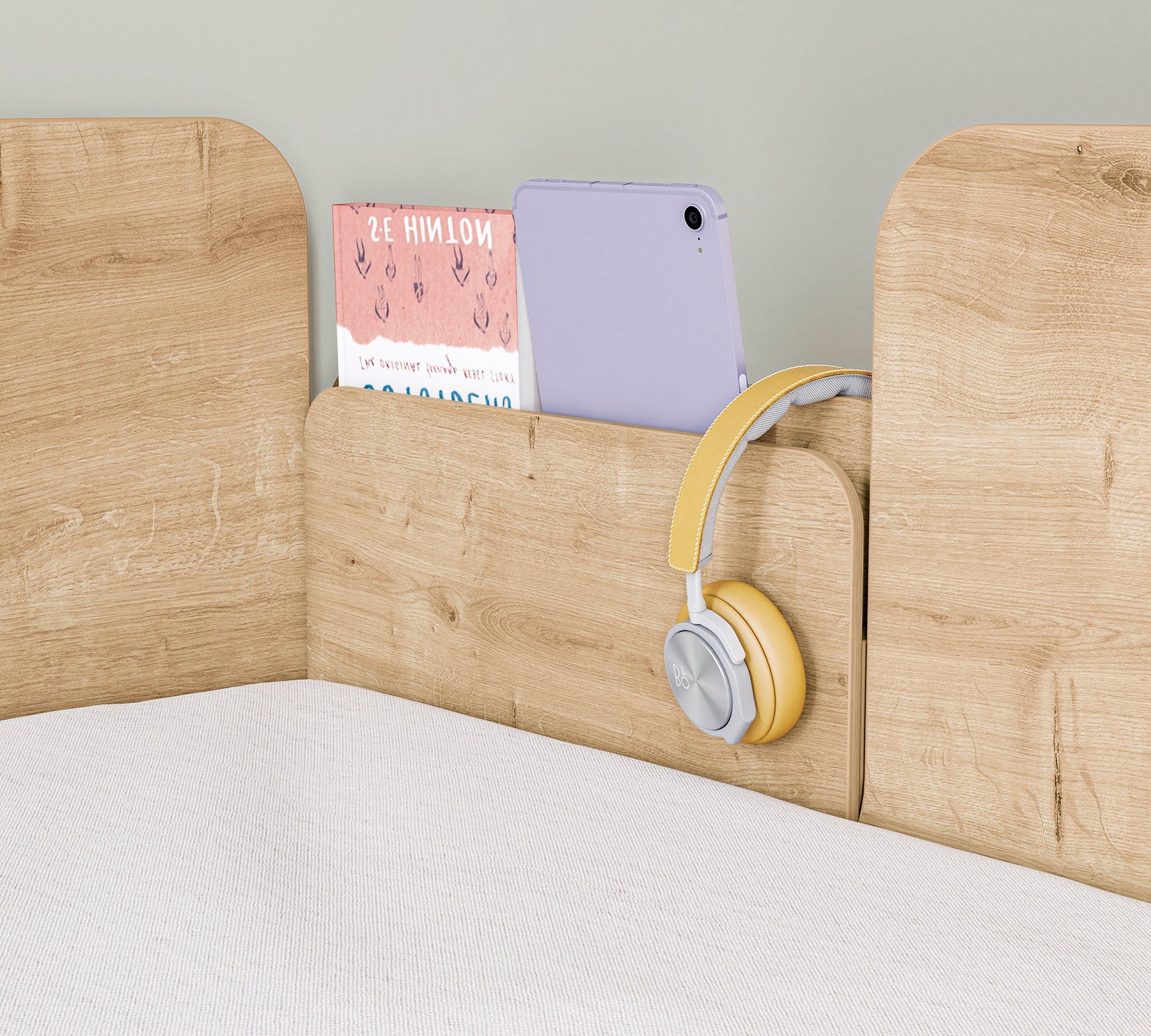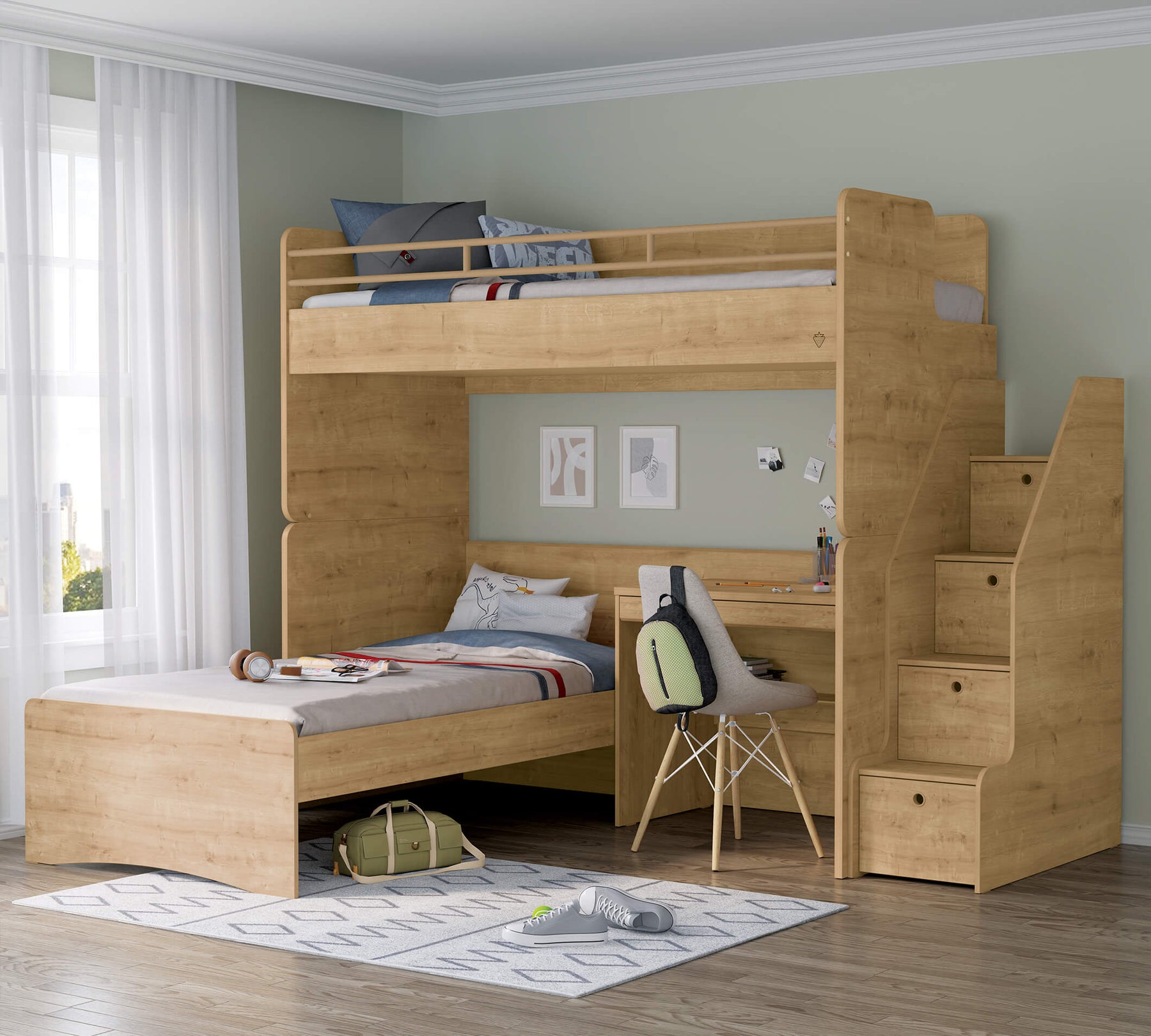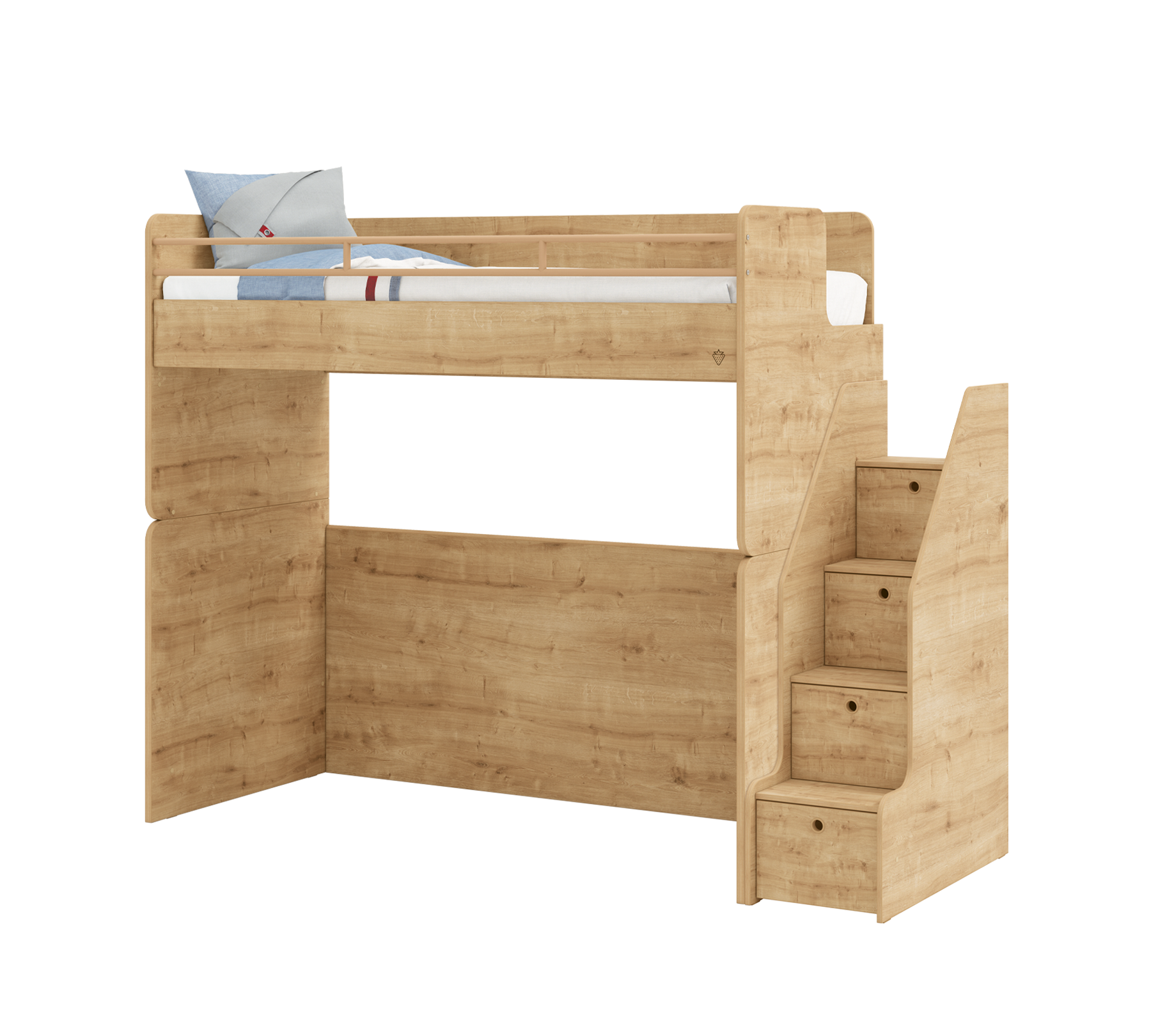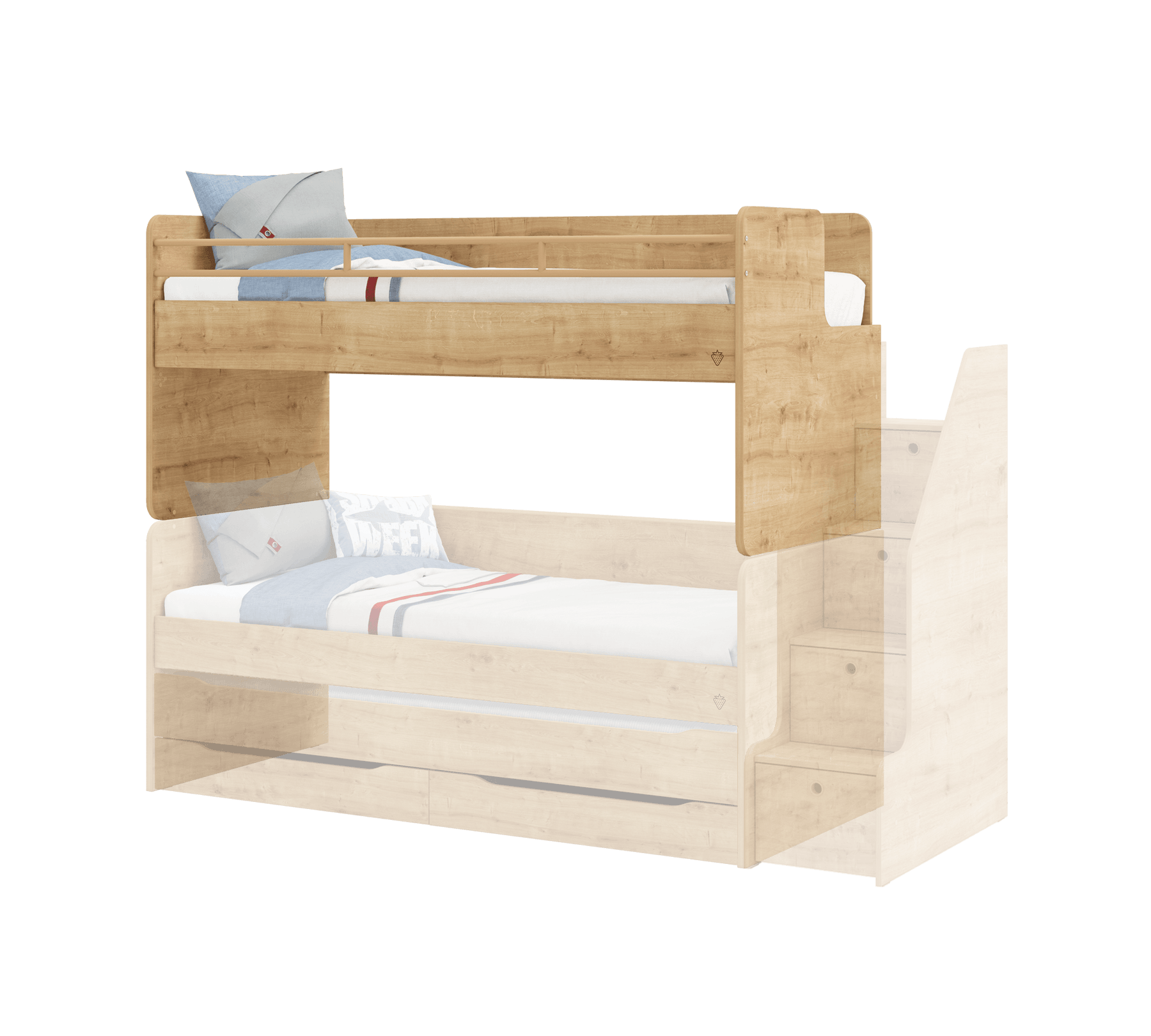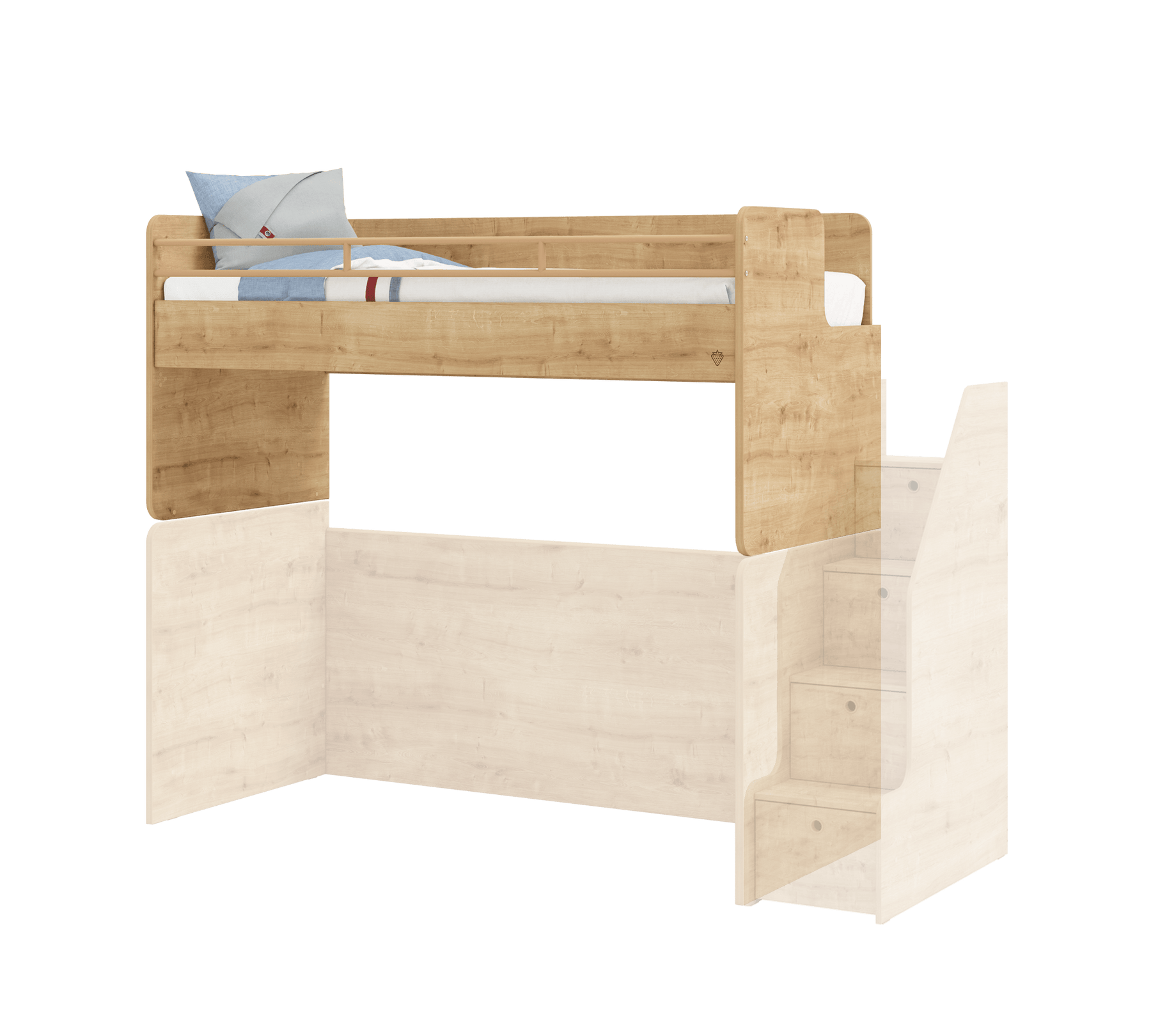 Krevati i sipërm i studios, i cili është zona e sipërme e gjumit të krevatit marinari në studio, mund të përdoret me një shkallë metalike ose kabineti. Rafti portativ i librave pranë shtratit ofron një zgjidhje funksionale për të apasionuarit pas leximit.